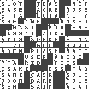 ACROSS 1. Position in a hierarchy or organization 5. Afternoon social gatherings 9. Fish or hair follower 12. Comfort 13. 1/640 square mile 14. Characteristic smell of wine 15. Singer James 16. Globular water bottle used in Asia 17. Municipality 18. A female animal or person 19. One (Scot) 21. Administered medicine 22. Political cartoonist Thomas 24. River (Sp.) 26. Compass dir. 27. Slender Brazilian palm 28. Opera by Verdi 29. Opinion 30. Something which is sent 32. Inactive volcano in Sicily 36. Not recorded 37. Unit of force equal to gravity 38. Carrot, for example 39. Arabian gulf 40. Suffix with ecto or cyto 42. Nathan's nickname 43. One who makes use of a thing 44. Remain 46. Parent Teacher Assoc. 49. To free from 50. Sliced desserts 51. 1973 Nobel Price Winner (Physics) Leo 53. Double-curved letter 54. Keyboard key 57. Indian skirt 58. Keg 61. Not divided or shared with others 62. Scent 63. Have the gumption 64. Lacquered or enameled metalware 65. Elected rep. 66. Stated 67. Having or resembling wings DOWN 1. Observes 2. Thin strip of wood or metal 3. Clearly or manifestly demonstrative 4. Beverage made from leaves 5. Falsehood 6. Environmental prefix 7. Nonscientific branch of learning 8. Ocean 9. Annoying sound 10. _____ Park, CO 11. Miss Universe 1986, Barbara Palacios _ 14. Non-commissioned officer (abbr.) 19. White ___ sheet 20. Nuclear Threat Initiatives 21. ___ good deed 23. NE Netherlands city 24. Amusement-park features 25. Binary compound 27. Enthusiastic 28. Approach 29. Wing 31. Stared at amorously 32. Bert's buddy 33. Inedible or poisonous agaric 34. Make mention of 35. Had dinner 40. 23rd letter of the Greek alphabet 41. Atlas contents 43. RI univ. 45. Twice 46. Mexican monetary units 47. Sadhe (variant) 48. Composer Copland 52. Apertif with cassis 53. Made supply last 55. Silent film actress Nazimova 56. Fermented drink made from hops 58. Music discs 59. American Automobile Association (abbr.) 60. _ Lanka 61. R.R. building