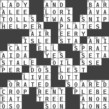ACROSS 1. Kenny Rogers chart-topper in '80 5. Also 8. Soap unit 11. Toward shelter 12. Australian parrot (variant) 14. Actress Gardner 15. For Whom the Bell _____ 17. It was, poetically 18. Sever or remove by pinching or nipping 19. Aide 21. Food holders 23. Wind 25. Suggestive of the supernatural 26. Small island 27. R.R. building 28. Cuckoo 31. Domesticated feline 33. Pipe bend 35. Small fatty European fish 37. Opera by Verdi 38. Affirmative reply 40. Stalk of a moss capsule 41. Lacking originality or spontaneity 43. Petroleum 45. Compass dir. 46. For each 47. Two (Sp.) 50. For fear that 52. Not recorded 53. Baseball player Mel 54. Declaimed 56. Flew 61. Riding implement 62. Monthly bill 65. Military trainee 66. Erode 67. Relationship diagram 68. Soon (poet.) 69. Bear (Spanish) 70. Manchild 71. Charged atoms DOWN 1. Thin strip of wood or metal 2. _ vera 3. Small valley 4. Sharp bark 5. Keyboard modifier key 6. Immediately 7. Window treatments 8. Object of repulsion 9. Advice 10. Hit sharply and swiftly 13. Small island 16. Oceans 18. Filthy place 20. Cause heat under the collar 22. Ancient river in northeast Turkey 24. Trust 26. Slanted text style (abbr.) 28. Ancient Greek god of war 29. Nathan's nickname 30. Call ___ day 31. Quote 32. The sixth month of the Jewish calendar 34. Lion 36. Inconspicuous attention getter 37. Viper 39. Grain storage tower 42. Prepare for publication 44. Allows 48. Unconcealed 49. Spring feasts 51. Close up, plug up 52. Infant locale 54. Mouths or openings 55. Printing process, for short 57. Jai ____ 58. Western Nevada city 59. Inky black, to poets 60. Cub Scout units 61. Corporate head (abbr.) 63. Modern: prefix 64. Nine, plus one
