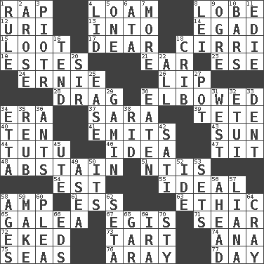 ACROSS 1. Strike 4. Rich soil 8. Ear part 12. RI univ. 13. To the inside or interior of 14. Mild oath 15. Spoils 17. Letter starter 18. High-altitude cloud 19. _____ Park, CO 21. Ewer handle 23. Compass dir. 24. Bert's buddy 26. Mouth edge 28. To trail on the ground 30. Turned at an angle; bent 34. Epoch 37. "Two Mules for Sister ____" 39. False hair 40. Nine, plus one 41. Sends forth 43. Player for Phoenix 44. Ballerina skirt 46. The content of cognition 47. Teat (slang) 48. Refrain by choice 51. Nuclear Threat Initiatives 54. Eastern Standard Time (abbr.) 55. Standard of perfection 58. Electrical Unit 61. Curvy letter 63. Value system 65. An organ shaped like a helmet 67. The front part of a cuirass 71. Burn superficially 72. Supplemented with great effort 73. Small pie 74. Santa ___, CA 75. Oceans 76. Like ___ of sunshine 77. 24 hours DOWN 1. Court order 2. Came up 3. Peter (Polish) 4. Hat (slang) 5. Single 6. _ moment's notice (2 wds.) 7. Greater amount 8. Flowery wreath 9. Legendary monster 10. Soap units 11. Singer Brickell 16. Look after 18. Baby bed with high sides 20. Title for a knight 22. 100% 25. Relaxation 27. Plant holder 29. Street urchin 30. Ingested 31. 270 degrees 32. Needle holder 33. Scratch 34. Singer James 35. Reuben's nickname 36. Pismires 38. To free from 42. Suttee (variant) 45. Shoshoni 49. At sea 50. ___ a Wonderful Life 52. Binary compound 53. Arranges properly for use 56. At or in the front 57. Woody, climbing, usually tropical plant 58. Eons 59. Create 60. Entreaty 62. Bristle 64. Supercomputer manufacturer 66. Begley and Asner 68. Slender fish 69. Lyricist Gershwin 70. Filthy place