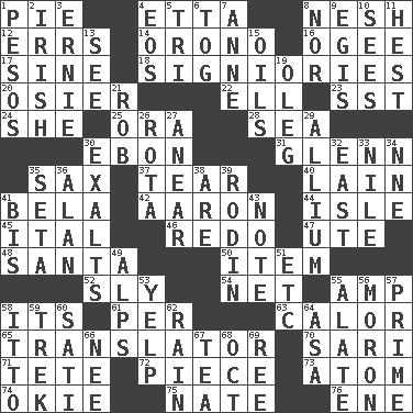 ACROSS 1. Sliced dessert 4. Singer James 8. Delicate 12. Blunders 14. U. of Maine site 16. Double curve, resembling the letter S 17. Trig term 18. Seigniories (variant) 20. Flexible twig of a willow tree 22. Pipe bend 23. Fast jet (abbr.) 24. A female animal or person 25. Mouth or opening 28. Ocean 30. Inky black, to poets 31. American astronaut and politician John 35. Saxophone 37. Rend 40. (Had) reclined 41. Actor Lugosi 42. Composer Copland 44. Capri or Wight 45. Slanted text style (abbr.) 46. Do over again 47. Shoshoni 48. Before Barbara or Clara 50. Detail 52. Mischievous 54. Fish or hair follower 55. Electrical Unit 58. It is 61. For each 63. Bodily heat indicating an inflammation 65. Interpreter 70. Indian skirt 71. False hair 72. Part 73. Tiny particle 74. Migrant worker of the '30s 75. Nathan's nickname 76. Compass dir. DOWN 1. Mexican monetary units 2. From or relating to Ireland 3. Bert's buddy 4. Greek goddess of the dawn 5. Three (prefix) 6. Coat; cloak 7. Queen of England 1702-14 8. Or not 9. The front part of a cuirass 10. Observes 11. Command 13. Observe 15. Petroleums 19. Cassini of fashion 21. Director Reiner 26. Roll call or roster of names 27. Approach 29. Plant genus of onion and garlic 30. Honors 32. 90 degrees 33. The longest river in the world 34. Compass dir. 35. Stalk of a moss capsule 36. ____ Jay Lerner 38. "We ___ not amused" (Victoria) 39. "The Thinker" sculptor 41. Again 43. Musical sound 49. High mountains 51. And so on (abbr.) 53. Sharp bark 55. Having winglike extensions 56. Person of subnormal intelligence 57. First class 58. "Tell ____ the Marines!" 59. Long journey 60. Suttee (variant) 62. Precipitation 64. White ___ sheet 66. Born 67. Beverage made from leaves 68. Sep. follower 69. Portuguese money of account (variant)