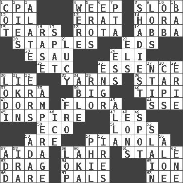 ACROSS 1. Accounting whiz (abbr.) 4. Shed a tear 8. Oscar Madison type 12. Petroleum 13. Part of Q.E.F. 14. Israeli folk dance 15. Separates forcefully 18. Roll call or roster of names 19. Swedish rock group 20. Paper fasteners 22. Begley and Asner 23. Son of Isaac 24. Connecticut Ivy Leaguer 25. And so on (abbr.) 26. Substance 30. Whopper 33. Entertaining tales 36. Play the lead 37. Gumbo ingredient 39. Large 40. Native american tent (variation) 41. Dormintory (informal) 42. Plants 44. Compass dir. 45. Stimulate to action 47. French article 50. Environmental prefix 51. Chops off 53. "We ___ not amused" (Victoria) 54. Player piano 57. Opera by Verdi 59. Cowardly lion portrayer 61. Having lost freshness 63. To be drawn or hauled along 64. Migrant worker of the '30s 65. Electrically charged atom 66. Have the gumption 67. Friends 68. Born DOWN 1. Small bed 2. Sliced desserts 3. Having winglike extensions 4. Past tense of be (plural) 5. Greek god of love 6. Ingest 7. Parent Teacher Assoc. 8. Most dark, concealed or hidden 9. Tennis shots 10. Globe 11. Sound made by sheep 16. Raze (variant) 17. Argument over a trivial matter 21. "I Love _" 22. Raised railways 24. Curvy letter 26. Engineer (abbr.) 27. Nuclear Threat Initiatives 28. Smile enhancers 29. One of the Great Lakes 30. Farming town in central California 31. Picture 32. Blunders 34. Competent 35. River (Sp.) 38. Electrical Measurement 42. From 43. Silent film actress Nazimova 46. Frozen water 48. Immeasurably long periods of time 49. Blemish 52. Killed 53. The sixth month of the Jewish calendar 54. Silvers or Donahue 55. Angers 56. _ vera 57. Find the sum of 58. Retirement account (abbr.) 59. Chop off 60. Alias (abbr.) 62. Compass dir.