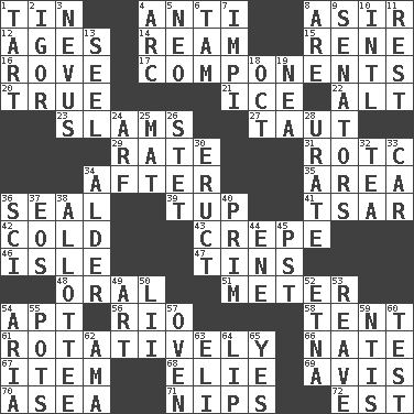 ACROSS 1. Metal container 4. Opposed to 8. SW Saudi Arabia district 12. Ripens 14. 480, 500 or 516 sheets of paper 15. French philosopher Descartes 16. Be footloose 17. Pieces 20. Loyal 21. Frozen water 22. Keyboard modifier key 23. Criticizes harshly 27. Drawn tight 29. Pace 31. College mil. group 34. Following 35. Type of rug 36. Lick closed 39. Uncastrated adult male sheep 41. Russian ruler of old 42. Chilled 43. Streamer paper 46. Capri or Wight 47. Metal containers 48. Taken by mouth 51. Distance measurement 54. Fitting 56. River (Sp.) 58. Portable shelter 61. Happening in regular succession 66. Nathan's nickname 67. A whole individual unit 68. Writer Wiesel 69. Advice 70. At sea 71. Pinches, bites 72. Eastern Standard Time (abbr.) DOWN 1. Small pie 2. Russian composer Stravinsky 3. Congenital growth or mark on the skin 4. Curve 5. Modern: prefix 6. Scottish cap 7. Body of Kaffir warriors 8. "We ___ not amused" (Victoria) 9. Elected representatives 10. International (abbr.) 11. Repose 13. Sew up the eyelids of hawks and falcons 18. Sep. follower 19. Teachers' org. 24. Sandy's bark 25. Floor protector 26. Proofreading order 28. A salt of uric acid 30. Spew [out] 32. Beverage made from leaves 33. Automobile 34. Tree or shrub in the Birch family 36. _-fi 37. Greek goddess of the dawn 38. One to whom something is allotted 40. Demure 44. Compass dir. 45. Pacific Standard Time (abbr.) 49. Tate display 50. Cards in a Roman deck? 52. Inactive volcano in Sicily 53. Rob, plunder, or pillage 54. Roberta Peters solo 55. Cooking vessels 57. Baking chamber 59. Nuclear Threat Initiatives 60. Trial 62. Nanny (var.) 63. Biblical high priest 64. Mouth edge 65. Affirmative reply