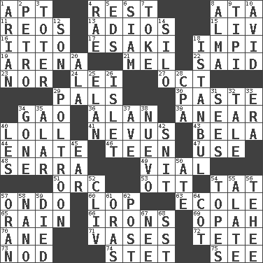 ACROSS 1. Fitting 4. Relief 8. "One Day ___ Time" 11. Vintage cars 13. Goodbye (Sp.) 15. 54 in ancient Rome 16. "Tell ____ the Marines!" 17. 1973 Nobel Price Winner (Physics) Leo 18. Body of Kaffir warriors 19. Sports stadium 21. Cartoonist voice _ Blanc 22. Expressed in words 23. And not 24. Luau accessory 27. Sep. follower 29. Friends 30. Thick mixture 34. E Mali city 36. ____ Jay Lerner 39. Approach 40. Hang loosely or laxly 41. Congenital growth or mark on the skin 43. Actor Lugosi 44. Maternal 46. Adolescent 47. Purpose 48. Spanish missionary in California 49. Small bottle 51. The grampus (Milton) 53. Baseball player Mel 54. Make lace 57. Southwest Nigerian state 60. Chop off 63. Learning spot: Fr. 65. Precipitation 66. Removes the wrinkles 69. Brightly colored fish 70. One (Scot) 71. Flower holders 72. False hair 73. Allow head to fall sleepily 74. Proofreading order 75. Observe DOWN 1. Believer in; advocate of (suffix) 2. Stone: prefix 3. Carrier 4. Actress Charlotte 5. Begley and Asner 6. Thailand, formerly 7. Casino tip 8. _ mater 9. Native american tent (variation) 10. Enthusiastic 12. Male offspring 14. Grain storage tower 18. Byzantium, centuries later 20. Wing 25. Enthusiasm 26. Small island 28. Numbers guy (abbr.) 29. Characterized by complete cowardliness 31. Perceives with the eye 32. Story 33. Epoch 34. Went 35. Having or resembling wings 37. "___ Maria" 38. New (sp.) 40. French article 42. In a ____ (agitated or irritated) 45. Ewer handle 50. Had dinner 52. 154 in Roman numerals 54. Drinks excessively 55. Having winglike extensions 56. Giggle 57. Northwest Algerian city 58. Billionth: prefix 59. Passed on 61. Mouths or openings 62. Mail 64. Small bed 67. Born 68. Fast jet (abbr.)