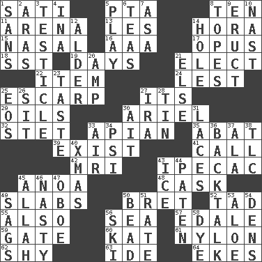 ACROSS 1. Suttee (variant) 5. Parent Teacher Assoc. 8. Nine, plus one 11. Sports stadium 13. French article 14. Israeli folk dance 15. Rhinal 16. Auto club (abbr.) 17. Musical composition 18. Fast jet (abbr.) 19. 24-hour periods 21. Opt 22. Detail 24. For fear that 25. Fortification 27. It is 29. Lubricates 30. Satellite of Uranus 32. Proofreading order 33. Bee-related 35. Blind as ____ 39. Be extant 41. Give a ring to 42. Medical imaging device (abbr.) 43. Medicinal drug used to evoke vomiting 45. Small Philippine buffalo 48. Keg 49. Broad, flat, thick pieces 50. Cy Young winner Saberhagen 52. Small boy 55. In addition 56. Ocean 57. Peak District village in England 59. Yard entry 60. Krazy ___ of comics 61. High-strength synthetic material 62. Like a shrinking violet 63. Binary compound 64. Supplements with great effort DOWN 1. Without 2. Ancient river in northeast Turkey 3. One of the two male reproductive glands 4. _ tizzy (2 wds.) 5. Romp 6. Afternoon social gatherings 7. White ___ sheet 8. Drinks excessively 9. Spew [out] 10. Political cartoonist Thomas 12. Tree or shrub in the Birch family 14. Opening into or through something 20. Electrical Unit 21. Otherwise 23. Clothes sense 25. Greek goddess of the dawn 26. Be seated 27. Retirement account (abbr.) 28. Shallow baking pan 30. Small island 31. Shoestrings 33. Wind 34. 23rd letter of the Greek alphabet 36. Sass 37. According to 38. Affectionate concern, for short 40. Dec. holiday 43. Frozen water 44. Eucharist need 45. Assad's deity 46. Thoroughly unpleasant 47. Mitch Miller's instrument 49. Sinks 50. Necklace unit 51. Pace 53. Medicinal plant 54. Habitations of wild animals 56. What Jean-Claude Killy likes to do 58. Color