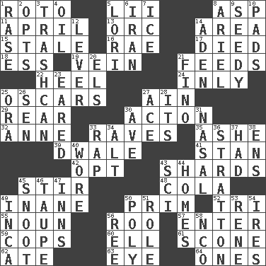 ACROSS 1. Printing process, for short 5. Cards in a Roman deck? 8. Viper 11. Showery time 13. The grampus (Milton) 14. Type of rug 15. Having lost freshness 16. Actress Charlotte 17. Passed on 18. Curvy letter 19. Distinctive style or manner 21. Gives food to 22. The bottom of a shoe or boot 24. Inwardly 25. Motion picture awards 27. The 18th letter of the Arabic alphabet 29. Located in or toward the back 30. NE Massachussets city 32. Singer Murray 33. All-night dance parties 35. American tennis player Robert 39. A sleeping potion; an opiate (poet.) 41. Comedian Laurel of Laurel & Hardy 42. Elect 43. Pottery fragments 45. Use a spoon 48. Root beer relative 49. Lacking in sense or substance 50. Demure 52. Three (prefix) 55. Part of speech 56. Friend of Pooh 57. Keyboard key 59. 911 reaches them 60. Pipe bend 61. Biscuitlike quick bread 62. Had dinner 63. Sight organ 64. Washington bills DOWN 1. To erase 2. Elects 3. File 13 4. Petroleum 5. Australian parrot (variant) 6. SW Asia republic 7. Frozen water 8. Satellite of Uranus 9. Full of seeds 10. Groovy apts. 12. Prying instrument 14. Arabian gulf 20. Raised railways 21. A pale, very dry sherry 23. Having ears or earlike features 25. Mouth or opening 26. Elected rep. 27. Adept person 28. It is 30. "___ Maria" 31. Relating to the nose 33. Reproach for some lapse or misdeed 34. The first octave above the treble staff 36. Ski resort town in Vermont 37. Possessed 38. Followers of ems 40. Had on 43. _-fi 44. Dwellings 45. Snout, nose 46. Grayish beige 47. Restaurants 49. South American Indian 50. Much (prefix) 51. Hero or heavy, e.g. 53. French philosopher Descartes 54. Angers 56. To sift 58. Non-commissioned officer (abbr.)