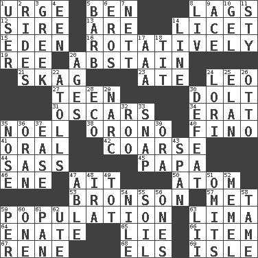 ACROSS 1. Goad 5. Benjamin's nick name 8. Fails to keep up a pace 12. Father 13. "We ___ not amused" (Victoria) 14. It is permitted: Lat. 15. Locale of original sin 16. Producing rotation 19. To separate or throw off 20. Choose not to consume 21. Heroin 23. Had dinner 24. Lion 27. Adolescent 30. Dunce 31. Motion picture awards 34. Part of Q.E.F. 35. Christmas carol 38. U. of Maine site 40. A pale, very dry sherry 41. Of the mouth 42. Rough 44. Backtalk 45. Dad 46. Compass dir. 47. Small island 50. Tiny particle 53. "Death Wish" actor 57. Was introduced to 59. Census information 63. Pale green bean 64. Maternal 65. Falsehood 66. A distinct part 67. French philosopher Descartes 68. Raised railways 69. Capri or Wight DOWN 1. One who makes use of a thing 2. Amusement-park features 3. Of Greece 4. Car or cant ending 5. Sharp remark 6. Greek god of love 7. Remaining after all deductions 8. 54 in ancient Rome 9. Adept person 10. Set 11. Filthy place 14. Actor's bit 17. American Automobile Association (abbr.) 18. Teat (slang) 20. Eons 22. Ringlike coral islands and reefs 24. Australian parrot (variant) 25. Liveliness 26. Von Bismarck 28. Environmental prefix 29. Drug cop 30. Outscore 32. Friend of Pooh 33. Fastener 35. Sense of smell 36. Northwest Algerian city 37. Comfort 39. Mouth or opening 43. Connect, as a bridge 47. Competent 48. Retirement account (abbr.) 49. Small child 51. Leaves out 52. Klaipeda city 54. Mediterranean tributary 55. Land 56. Singles 58. Not wild 59. For each 60. Single 61. Baking dish 62. Shoshoni 63. Cards in a Roman deck?