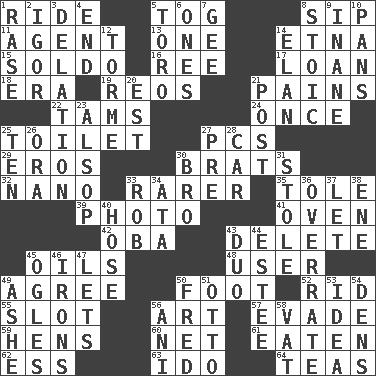 ACROSS 1. Travel on or in a vehicle 5. Coat; cloak 8. Small drink 11. Representative 13. Single 14. Inactive volcano in Sicily 15. Twentieth part of a lira 16. To riddle 17. Grant temporary use of 18. Period 19. Vintage cars 21. Aches 22. Scottish caps 24. Single time 25. Bathroom plumbing fixture 27. Personal Computers (abbr.) 29. Greek god of love 30. Naughty children 32. Billionth: prefix 33. Less widely known 35. Lacquered or enameled metalware 39. Picture 41. Baking chamber 42. Chief or king in Benin or Nigeria 43. Erase 45. Lubricates 48. One who makes use of a thing 49. Match 50. 12 inches 52. To free from 55. Narrow opening 56. Tate display 57. Elude 59. Coop moms 60. Fish or hair follower 61. Consumed 62. Curvy letter 63. Wedding promise 64. Beverages made from leaves DOWN 1. To erase 2. Composer Stravinsky 3. Accusation by an informer 4. Conclusion 5. "Corrida" creature 6. Singles 7. Turn to the right 8. Unemotional 9. Lacking in sense or substance 10. Zero-star reviews 12. Singer Mel 14. Liveliness 20. Eastern Standard Time (abbr.) 21. Mail 23. Columnist Joseph or Stewart 25. Nine, plus one 26. Mouth or opening 27. Before (prefix) 28. 4-wheeled motor vehicle 30. Sis' sibling 31. Took without asking 33. Director Reiner 34. "One Day ___ Time" 36. Make much ado about nothing 37. Allow 38. Compass dir. 40. Flexible conduit 43. Superhero pair 44. First name in cosmetics 45. Stares at amorously 46. Metal shackles 47. Allows 49. American tennis player Robert 50. Flintstone 51. "Beetle Bailey" pooch 53. It may be bright or harebrained 54. Habitations of wild animals 56. Cuckoo 58. Large container