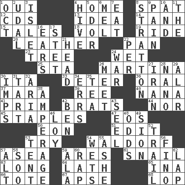 ACROSS 1. Fr. "Yes" 4. Residence 8. Argument over a trivial matter 12. Music discs 13. It may be bright or harebrained 14. Hyperbolic tangent 15. Stories 18. Electrical Unit 19. Travel on an animal 20. Cordwainer's material 22. Baking dish 23. Family _ (genealogy) 24. Soggy 25. R.R. building 26. Chrissie's court nemesis 30. Call ___ day 33. Prevent from occurring 36. Of the mouth 37. Hindu Mythology: god of death 39. To riddle 40. Nanny 41. Demure 42. Naughty children 44. Or not 45. Paper fasteners 47. Greek goddess of the dawn 50. A really long time 51. Prepare for publication 53. Attempt to accomplish something 54. Apple salad 57. At sea 59. Ancient Greek god of war 61. Slow-paced one 63. Yearn 64. Thin strip of wood or metal 65. _ tizzy (2 wds.) 66. Carryall 67. Domed church section 68. Chop off DOWN 1. Sep. follower 2. Freehold land 3. Small island 4. Hub of activity 5. Aroma 6. Cartoonist voice _ Blanc 7. Consume 8. Ski resort town in Vermont 9. Ache 10. Plus 11. Definite Article 16. Hearing organs 17. Proofreading order 21. Froth on beer 22. For each 24. Armed conflict 26. Confront 27. SW Asia republic 28. Billionth: prefix 29. Having or resembling wings 30. Naughty children 31. Small pie 32. Roberta Peters solo 34. Blunders 35. Afternoon social gathering 38. Electrical Measurement 42. Benjamin's nick name 43. Stitch closed the eyes of (a falcon) 46. Myrna of the movies 48. Likelihood 49. The Jewish people; Israel 52. Drop behind 53. Portable shelter 54. Soaks 55. American tennis player Robert 56. A pale, very dry sherry 57. Keyboard modifier key 58. "Barney Miller" actor Jack 59. In the manner of 60. Reproach for some lapse or misdeed 62. Infant locale