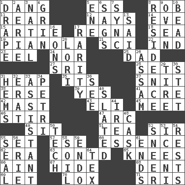 ACROSS 1. Mild oath, euphamism for damn 5. Curvy letter 8. Director Reiner 11. Buttocks 12. Negative votes 14. First lady 15. Nick name for Arthur 17. Canadian anthropologist Darnell 18. Ocean 19. Player piano 21. _-fi 22. Indiana (abbr.) 23. Snakelike fish 24. And not 25. June honoree 27. _ Lanka 28. Arranges properly for use 31. Pile 35. ___ a Wonderful Life 37. In a ____ (agitated or irritated) 38. Celtic language 39. Consenting reply 41. 43,560 square feet 42. Vertical spar for supporting sails 43. Connecticut Ivy Leaguer 45. Rendezvous 46. Disorderly outburst 47. Curve 49. Be seated 51. Afternoon social gathering 52. Title for a knight 55. Arrange properly for use 57. Compass dir. 60. Substance 62. Epoch 63. Continued (abbr.) 65. Leg joints 66. The 18th letter of the Arabic alphabet 67. Flintstone garb 68. Incision 69. Allow 70. Brine-cured salmon 71. Indian titles of respect DOWN 1. Window treatment 2. Nest on high 3. Relating to or accompanying birth 4. Amused look 5. Compass dir. 6. Settles 7. Synchronize (abbr.) 8. Home 9. Baking chamber 10. Necklace unit 13. Alleged 16. Immeasurably long periods of time 17. Noteworthy scarcity 20. Australian parrot (variant) 26. Indian state 29. Become fatigued 30. Proofreading order 31. Equivocates 32. Part of Q.E.F. 33. Aide 34. _ dish (used to culture cells) 36. Observe 40. Scheduled 44. Angers 48. Keg 50. Technical work 52. Scornful expression 53. Ancient Celtic tribe of eastern Britain 54. Musical pauses 55. Lick closed 56. One of the Great Lakes 58. The visible part of the earth's surface 59. Inside; within (prefix) 61. Extremities 64. John Ritter's dad