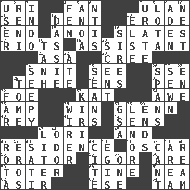 ACROSS 1. RI univ. 4. Air blower 7. ____ Bator, Mongolia 11. Elected rep. 12. Incision 13. Eat (away) 14. Conclude 15. Mine, in Marseilles 16. Chalkboards 17. Disturbances 19. Aide 21. White ___ sheet 23. Algonquian 24. In a ____ (agitated or irritated) 25. Observe 26. Compass dir. 29. Giggle 30. Followers of ems 31. Fenced enclosure 32. Enemy 33. Krazy ___ of comics 34. Deep reverence 35. Electrical Unit 36. Victory 37. American astronaut and politician John 40. Marina Del _, California 41. Big collection agency 42. Elected reps. 43. Australian parrot (variant) 45. Added to 46. Home 51. Witty Wilde 55. Speaker 56. Russian composer Stravinsky 58. "We ___ not amused" (Victoria) 59. Carrier 60. Prong on a fork 61. Teachers' org. 62. SW Saudi Arabia district 63. Compass dir. 64. Scottish cap DOWN 1. One who makes use of a thing 2. Painter Guido (1575-1642) 3. Southeast Asian peninsula 4. Opposite of masc. 5. Small Philippine buffalo 6. Nuclear Threat Initiatives 7. A salt of uric acid 8. Globular water bottle used in Asia 9. Arabian gulf 10. A home for chicks 12. Small ungulate mammals of Africa 13. Otherwise 16. Male parents of animals 18. Hyperbolic tangent 20. Aroma 22. Had dinner 24. Oozy 25. Seines 26. Connects, as a bridge 27. Stitched 28. Compass dir. 29. Heavy book 32. At a great distance 33. Japanese brewing company 36. One who wires 37. Girls' org. (abbr.) 38. Poe poem 39. Extremities 43. 61 cubic inches 44. Scent 46. Roll call or roster of names 47. Greek god of love 48. Suttee (variant) 49. Quote 50. Armor plate that protects the chest 52. Patter 53. Length times width 54. 480, 500 or 516 sheets of paper 57. Single