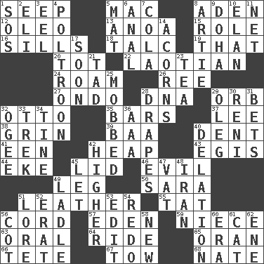 ACROSS 1. Ooze 5. Apple computer (short form) 8. Arabian gulf 12. Margarine 13. Small Philippine buffalo 15. Hero or heavy, e.g. 16. Beverly of Met fame 18. Baby powder 19. Not this but _ 20. Small child 22. Of or relating to Laos or its people 24. Wander 26. To riddle 27. Southwest Nigerian state 28. Heredity factor (abbr.) 29. Globe 32. "Beetle Bailey" pooch 35. Long, evenly shaped pieces 37. Area sheltered from the wind 38. Broad smile 39. Sound made by sheep 40. Incision 41. Car or cant ending 42. Pile 43. Armor plate that protects the chest 44. Make supply last 45. Flaplike covering 46. Morally bad or wrong 49. Part of a journey 50. "Two Mules for Sister ____" 51. Cordwainer's material 55. Make lace 56. Drawstring 57. Locale of original sin 59. Sibling's daughter 63. Relating to the mouth 64. Travel on an animal 65. Northwest Algerian city 66. False hair 67. Pull behind 68. Nathan's nickname DOWN 1. Mayday 2. Biblical high priest 3. Snakelike fish 4. Coward 5. Floor covering 6. Of or related to the anus 7. Root beer relative 8. Nick name for Arthur 9. Capital of the state of Qatar 10. Style 11. Fish or hair follower 14. Oak nuts 17. Within a short period 21. Small amount or degree 23. Beverage made from leaves 25. Crowded into 28. Window treatments 29. Cassini of fashion 30. Painter Guido (1575-1642) 31. Antes 32. Double curve, resembling the letter S 33. Long journey 34. Prong on a fork 36. American Automobile Association (abbr.) 40. Accusation by an informer 42. Having greater elevation 45. Allow 47. Large container 48. SW Asia republic 49. Dipping utensil 51. Old wives' tales, e.g. 52. Part of Q.E.F. 53. Prepare for publication 54. Do over again 56. Small bed 58. ___ Haven, CT 60. Period 61. Domesticated feline 62. Compass dir.