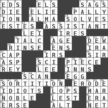ACROSS 1. Begley and Asner 4. Raised railways 7. Sinks 11. Expire 12. Writer Wiesel 13. Friendly 14. Electrically charged atom 15. _ mater 16. Finds the solution 17. _____ Park, CO 19. Helper 21. Flowery wreath 23. Angers 24. Baby powder 25. Personal question 26. Morning condensation 29. Remove soap 30. Followers of ems 31. Lyricist Gershwin 32. Head covering 33. Big collection agency 34. Title for a knight 35. Cleo's killer 36. _-fi 37. Part 40. Marina Del _, California 41. Area sheltered from the wind 42. Lodging establishments 43. Glance over 45. Oval reproductive body of a fowl 46. Drawing lots 51. Wear away 55. Foolish or stupid persons 56. Chops off 58. Third mo. 59. Having high moral qualities 60. For fear that 61. Epoch 62. Celtic language 63. Keyboard modifier key 64. Fish or hair follower DOWN 1. Singer Brickell 2. "Vaya con ____" 3. Transmitted 4. Pipe bend 5. Pale green bean 6. Oceans 7. Table seasonings 8. Inventor's middle name 9. Small, secluded valley 10. System (abbr.) 12. Artist's stands 13. Airs 16. Founders of families 18. Flair 20. Attaches a signature 22. Frozen water 24. Likely to tip or tilt 25. Nest on high 26. Flat circles 27. One of the Great Lakes 28. Armed conflict 29. Raze (variant) 32. Auto 33. Ancient Celtic tribe of eastern Britain 36. Narrow boards 37. Sliced dessert 38. Eat 39. Engineer (abbr.) 43. Fur scarf 44. Quote 46. Trig term 47. Aroma 48. Chest bones 49. Spanish pot 50. Christmas carol 52. Sign of something about to happen 53. Have the gumption 54. Part of Q.E.F. 57. Pacific Standard Time (abbr.)
