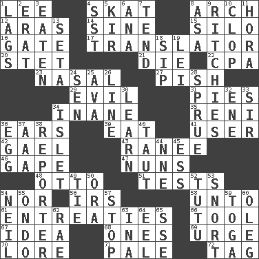 ACROSS 1. Area sheltered from the wind 4. Three-handed card game 8. Bowlike part 12. Ancient river in northeast Turkey 14. Trig term 15. Grain storage tower 16. Yard entry 17. Interpreter 20. Proofreading order 21. Pass on 22. Accounting whiz (abbr.) 23. Rhinal 27. Expression of disdain 29. Tending to cause great harm 31. Sliced desserts 34. Lacking in sense or substance 35. Painter Guido (1575-1642) 36. Hearing organs 39. Ingest 41. One who makes use of a thing 42. Highlander 43. Indian princess (variant) 46. Open wide 47. Religious women 48. Von Bismarck 51. Trials 54. Not either 56. Big collection agency 58. To (old English) 61. Pleas 66. Instrument 67. The main thing one is thinking about 68. Singles 69. Goad 70. Old wives' tales, e.g. 71. Light colored 72. Label DOWN 1. Fails to keep up a pace 2. Part of Q.E.F. 3. Consumed 4. Fast jet (abbr.) 5. Apertif with cassis 6. Santa ___, CA 7. Be inclined (to) 8. White ___ sheet 9. Actors Guy, Robert Welles, and Clint 10. Hoof sound 11. Israeli folk dance 13. Stalk of a moss capsule 18. Small drink 19. Luau accessory 24. Elected rep. 25. Actress Gardner 26. Actor's bit 28. Disorder 30. Memorize 32. Compass dir. 33. Title for a knight 34. Small island 36. Oval reproductive body of a fowl 37. American Automobile Association (abbr.) 38. News announcer 40. Pulled tight 44. Compass dir. 45. Curvy letter 49. Neckwear 50. Mouth or opening 52. Ballerina skirt 53. Derisive sound 54. Famous astronaut Armstrong 55. Southwest Nigerian state 57. Halt 59. Ancient Roman robe 60. Cassini of fashion 62. Actress Charlotte 63. _ tizzy (2 wds.) 64. Snakelike fish 65. Compass dir.