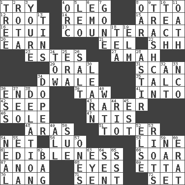 ACROSS 1. Attempt 4. Cassini of fashion 8. Von Bismarck 12. Carrot, for example 14. San ____ (Riviera town) 15. Length times width 16. Needle holder 17. Act in opposition 20. Merit 21. Snakelike fish 22. Quiet! 23. _____ Park, CO 27. Housemaid 29. Spoken 31. Glance over 34. A sleeping potion; an opiate (poet.) 35. Baby powder 36. Inside; within (prefix) 39. The 23rd letter of the Hebrew alphabet 41. To the inside or interior of 42. Ooze 43. Less widely known 46. Flatfish 47. Nuclear Threat Initiatives 48. Caspian sea tributary 51. Carrier 54. Fish or hair follower 56. Nilotic language 58. Actor's bit 61. The property of being fit to eat 66. Fly high 67. Small Philippine buffalo 68. Sight organs 69. Singer James 70. Austrian-born American filmmaker Fritz 71. Posted 72. Put into a specified state DOWN 1. Relationship diagram 2. Roll call or roster of names 3. You are 4. The grampus (Milton) 5. Lion 6. Australian flightless bird 7. Went 8. Rowing implement 9. File 13 10. Technician 11. Pledge 13. Airtight sealed metal containers 18. Beverage made from leaves 19. Shade tree 24. Pull behind 25. Epoch 26. Table seasoning 28. Moving or stirring 30. Acquire or gain knowledge or skills 32. Keyboard modifier key 33. Non-commissioned officer (abbr.) 34. Drug addict 36. Curvy letter 37. Modern: prefix 38. Accusation by an informer 40. Electrical Unit 44. _ de Janeiro 45. Eastern Standard Time (abbr.) 49. Everything 50. Institute legal proceedings 52. Otherwise 53. Disturbances 54. Actress Patricia 55. Pulitzer Prize-winning author Ferber 57. Washington bills 59. Nathan's nickname 60. Part of Q.E.F. 62. Container for groceries 63. Sight organ 64. Elected rep. 65. Fast jet (abbr.)