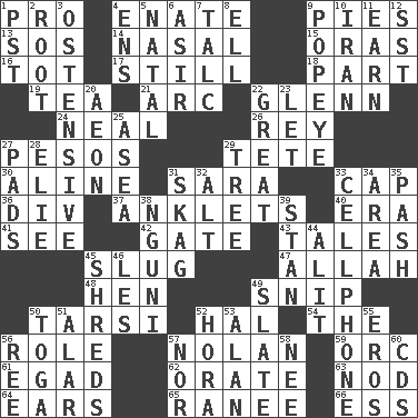 ACROSS 1. Adept person 4. Maternal 9. Sliced desserts 13. Mayday 14. Rhinal 15. Mouths or openings 16. Small child 17. Free of sound 18. Piece 19. Beverage made from leaves 21. Curve 22. American astronaut and politician John 24. Anneal 26. Marina Del _, California 27. Mexican monetary units 29. False hair 30. Place in a line 31. "Two Mules for Sister ____" 33. Head covering 36. HTML Container Element 37. Short socks 40. Epoch 41. Perceive with the eye 42. Yard entry 43. Lies 45. Snaillike creature with no shell 47. Assad's deity 48. Layer 49. Clip 50. Tarsus (plural) 52. Actor Linden 54. Definite Article 56. Hero or heavy, e.g. 57. Pitcher Ryan 59. The grampus (Milton) 61. Mild oath 62. Speak pompously 63. Lower and raise head in agreement 64. Hearing organs 65. The wife of a rajah (variant) 66. Double-curved letter DOWN 1. Pacific Standard Time (abbr.) 2. Carrot, for example 3. Clearly or manifestly demonstrative 4. Followers of ems 5. Relating to or accompanying birth 6. SW Saudi Arabia district 7. Baby powder 8. Pipe bend 9. Wimpy's pal 10. SW Asia republic 11. Merit 12. Fast jet (abbr.) 20. A really long time 22. Relatively large 23. Allow 25. Toward the sea 27. Writing tablets 28. Writer Wiesel 29. Woody plant 31. Heroin 32. The first octave above the treble staff 33. Portable communications device 34. Type of rug 35. Romantic infatuation 38. Group of southern Bantu languages 39. Comedian Laurel of Laurel & Hardy 44. Came down and settled, as after flight 45. Tears up 46. French article 49. Chalkboard 50. Ancient Roman robe 51. Having or resembling wings 52. Israeli folk dance 53. ____ Jay Lerner 55. Greek god of love 56. To riddle 57. Or not 58. Born 60. Music discs