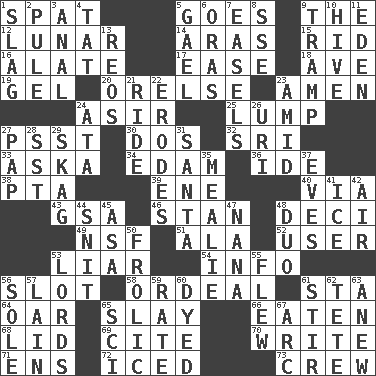 ACROSS 1. Argument over a trivial matter 5. Moves 9. Definite Article 12. Type of eclipse 14. Caspian sea tributary 15. To free from 16. Having winglike extensions 17. Relaxation 18. "___ Maria" 19. Set 20. Threatening words 23. So be it 24. SW Saudi Arabia district 25. Mass 27. Inconspicuous attention getter 30. Two (Sp.) 32. Indian title of respect (Mr.) 33. "____ silly question..." 34. Dutch treat 36. Binary compound 38. Parent Teacher Assoc. 39. Compass dir. 40. By way of 43. Girls' org. (abbr.) 46. Comedian Laurel of Laurel & Hardy 48. Tenth: prefix 49. Overdraft (abbr.) 51. Insect wing 52. One who uses or employs something 53. One who doesn't tell the truth 54. Information 56. Groove 58. Severe or trying experience 61. R.R. building 64. Rowing implement 65. Kill 66. Ingested 68. Flaplike covering 69. Quote 70. Compose 71. Followers of ems 72. On the rocks 73. Group working together DOWN 1. Volcanic refuse 2. Whimper 3. Of or related to the anus 4. Make lace 5. Highlander 6. Mouths or openings 7. Artist's stands 8. Compass dir. 9. _____ steamer (cargo ship) 10. Hub of activity 11. Paradise 13. Vintage cars 21. Travel on or in a vehicle 22. Eats (away) 23. Among 24. _ moment's notice (2 wds.) 26. RI univ. 27. Infant food 28. Fast jet (abbr.) 29. Heroin 31. Before Barbara or Clara 35. Ear of corn 37. Nights before holidays 41. Frozen water 42. Atmosphere 44. In a ____ (agitated or irritated) 45. White ___ sheet 47. Grandmother 48. Superhero pair 50. Romp 53. Domineers 55. Soared 56. Flatfish 57. (Had) reclined 59. Assign a rank or rating to 60. Colored 61. Move through with a circular motion 62. Wig 63. Afresh 65. _-fi 67. Curve