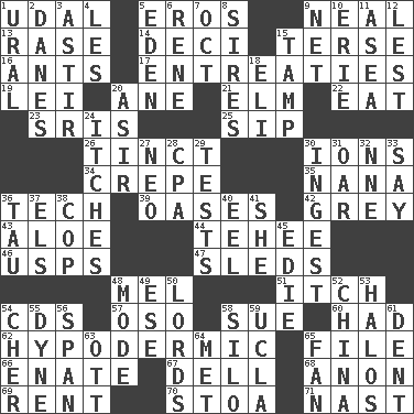 ACROSS 1. Freehold land 5. Greek god of love 9. Actress Patricia 13. To erase 14. Tenth: prefix 15. Laconic 16. Pismires 17. Pleas 19. Flowery wreath 20. A saturated hydrocarbon 21. Shade tree 22. Ingest 23. Indian titles of respect 25. Small drink 26. Colored lightly or faintly 30. Charged particles 34. Streamer paper 35. Nanny 36. Technical 39. Fertile tracts in a desert 42. Jennifer or Joel 43. Medicinal plant 44. Giggle 46. United States Postal Service (abbr.) 47. Bobsleighs 48. Cartoonist voice _ Blanc 51. Hankering 54. Music discs 57. Bear (Spanish) 58. Institute legal proceedings 60. Possessed 62. Under the skin 65. Do some clerical work 66. Related on the mother's side 67. Small valley 68. Soon (poet.) 69. Monthly bill 70. Portico 71. Political cartoonist Thomas DOWN 1. Mountain range 2. Natives or inhabitants of Denmark 3. Being in motion 4. French article 5. Locale of original sin 6. French philosopher Descartes 7. Sep. follower 8. Titles for men of rank and authority 9. Fish or hair follower 10. 4th largest of the Great Lakes 11. Toward the sea 12. For fear that 15. Pack (down) 18. Connecticut Ivy Leaguer 20. SW Saudi Arabia district 24. Strong, restless desires 27. Modern: prefix 28. Tax preparer (abbr.) 29. Trials 30. Eat 31. Boat paddle 32. Compass dir. 33. Declare 36. The 19th letter of the Greek alphabet 37. Raised railways 38. Police officer (slang) 40. Snakelike fish 41. A female animal or person 45. Singer Brickell 48. Method 49. Compass dir. 50. Domineers 52. Large country 53. Rings 54. "Mermaids" star 55. Unit of force 56. Connect, as a bridge 58. Grain storage tower 59. Southern CA. univ. 61. Incision 63. Baseball player Mel 64. Was introduced to 65. Avid follower