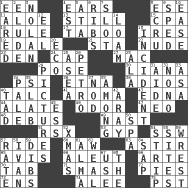 ACROSS 1. Car or cant ending 4. Hearing organs 8. Compass dir. 11. _ vera 13. Free from disturbance or agitation 15. Numbers guy (abbr.) 16. Governing power 17. Off limits 18. Angers 19. Peak District village in England 21. R.R. building 22. Naked 23. Lair 24. Head covering 27. Big _ 29. Airs 30. Woody, climbing, usually tropical plant 34. 23rd letter of the Greek alphabet 36. Inactive volcano in Sicily 39. Goodbye (Sp.) 40. Baby powder 41. Odor 43. Pulitzer Prize-winning author Ferber 44. Having winglike extensions 46. Scent 47. Modern: prefix 48. To get out of a bus 49. Political cartoonist Thomas 51. Acura sports coupe 53. Con 54. Compass dir. 57. Travel on or in a vehicle 60. Informal term for the mouth 63. Being in motion 65. Deliberation 66. Native American of Southwest Alaska 69. Johnson of "Laugh-In" 70. Bar bill 71. Box-office sellout 72. Sliced desserts 73. Followers of ems 74. Toward shelter 75. Pacific Standard Time (abbr.) DOWN 1. Having ears or earlike features 2. Evade 3. Pitcher Ryan 4. Eastern Standard Time (abbr.) 5. _ moment's notice (2 wds.) 6. Chest bones 7. Groove 8. Shade of tan 9. Broke a traffic law 10. Relaxation 12. Snakelike fish 14. Rich soil 18. Event 20. Environmental prefix 25. Toward the sea 26. Stone: prefix 28. In the manner of 29. Photos 31. Helper 32. Words to Nanette 33. White ___ sheet 34. Light colored 35. Broad, flat, thick piece 37. Lower and raise head in agreement 38. Amid 40. Small boy 42. Like ___ of sunshine 45. Double-curved letter 50. Health resort 52. Dec. holiday 54. Empty completely 55. Settings 56. Obtain by seizing forcibly or violently 57. Pace 58. "Terrible" tsar 59. Claim 61. _ mater 62. Welt 64. Plant excrement 67. Purpose 68. Definite Article