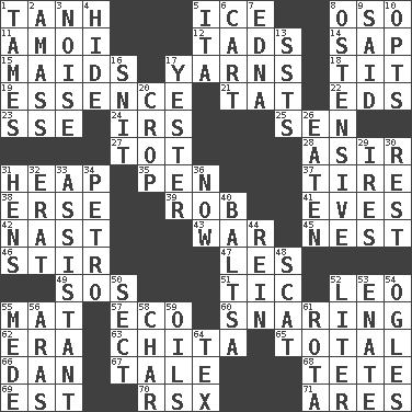 ACROSS 1. Hyperbolic tangent 5. Frozen water 8. Bear (Spanish) 11. Mine, in Marseilles 12. Small amounts or degrees 14. Plant excrement 15. Women servants 17. Entertaining tales 18. Teat (slang) 19. Substance 21. Make lace 22. Begley and Asner 23. Compass dir. 24. Big collection agency 25. Elected rep. 27. Small child 28. SW Saudi Arabia district 31. Pile 35. Animal enclosure 37. Become fatigued 38. Celtic language 39. Director Reiner 41. Nights before holidays 42. Political cartoonist Thomas 43. Armed conflict 45. A home for chicks 46. Disorderly outburst 47. French article 49. Mayday 51. Nervous spasm 52. Lion 55. Floor protector 57. Environmental prefix 60. Catching in a trap 62. Epoch 63. Riviera of "Kiss of the Spider Woman" 65. "_____ Recall" 66. Daniel's nick name 67. Story 68. Wig 69. Eastern Standard Time (abbr.) 70. Acura sports coupe 71. Ancient Greek god of war DOWN 1. Domesticates 2. Collect or gather 3. Annoying sound 4. Flintstone garb 5. Call ___ day 6. Heavy open wagon 7. Pulitzer Prize-winning author Ferber 8. Clearly or manifestly demonstrative 9. Alleged 10. Elects 13. Fast planes 16. In a ____ (agitated or irritated) 17. Last 20. Riding implement 26. Consumed 29. Angers 30. Relief 31. Coop moms 32. Part of Q.E.F. 33. Helper 34. Stone: prefix 36. At this time 40. Greek mezzo-soprano Agnes 44. It's straight from the horse's mouth 48. Scram, to a cat 50. Religious group 52. 61 cubic inches 53. Related on the mother's side 54. Stares 55. Ancient Persian 56. Ancient river in northeast Turkey 58. Burn to charcoal 59. Petroleums 61. Roll call or roster of names 64. John Ritter's dad