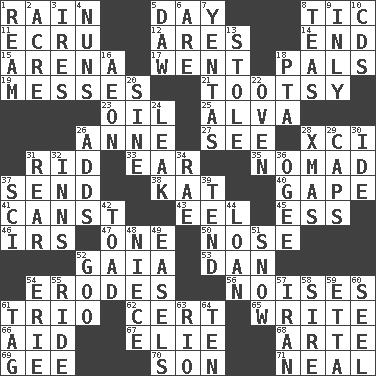 ACROSS 1. Precipitation 5. 24 hours 8. Nervous spasm 11. Shade of tan 12. Ancient Greek god of war 14. Conclusion 15. Sports stadium 17. Left 18. Friends 19. Makes clutter 21. A girl or young woman (variant) 23. Lubricate 25. Inventor's middle name 26. Queen of England 1702-14 27. Observe 28. One more than ninety 31. To free from 33. Ewer handle 35. Wanderer 37. Transmit 38. Krazy ___ of comics 40. Open wide 41. 2nd pers. sing. pres. of can (arch.) 43. Snakelike fish 45. Double-curved letter 46. Big collection agency 47. Single 50. Olfactory organ 52. Greek goddess of the earth (variant) 53. One of the 12 tribes of Israel 54. Eats (away) 56. Annoying sounds 61. Musical group of three 62. Sure thing 65. Compose 66. Help 67. Writer Wiesel 68. Johnson of "Laugh-In" 69. Unit of force equal to gravity 70. Manchild 71. Actress Patricia DOWN 1. 480, 500 or 516 sheets of paper 2. 1/640 square mile 3. Angers 4. Religious women 5. Simpleton 6. "We ___ not amused" (Victoria) 7. Gossips 8. Beverages made from leaves 9. In an inward manner 10. Music discs 13. Fur scarf 16. Age 18. Parent Teacher Assoc. 20. Trig term 22. Baking chamber 24. Path through which fluid escapes 26. Sums up 28. Dec. holiday 29. Balmoral and tarboosh 30. Binary compound 31. Hitchcock's "____ Window" 32. Lodging establishments 34. Actress Charlotte 36. Double curve, resembling the letter S 37. _-fi 39. Be inclined (to) 42. Frog relative 44. Grant temporary use of 48. Sibling's daughter 49. Artist's stands 51. Overwhelm 52. Thick or sticky substance 54. 4th largest of the Great Lakes 55. Travel on or in a vehicle 57. SW Asia republic 58. Title for a man of rank and authority 59. Singer James 60. Stitch closed the eyes of (a falcon) 61. Label 63. _ de Janeiro 64. "___ Little Indians"