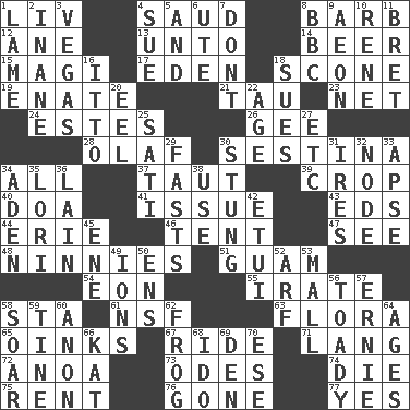ACROSS 1. 54 in ancient Rome 4. Saudi Arabian king (1953-1964) 8. Sharp remark 12. A saturated hydrocarbon 13. To (old English) 14. Fermented drink made from hops 15. Wise men 17. Locale of original sin 18. Biscuitlike quick bread 19. Maternal 21. The 19th letter of the Greek alphabet 23. Fish or hair follower 24. _____ Park, CO 26. Turn to the right 28. Norwegian king 30. French poetic form 34. Everything 37. Tense 39. Riding implement 40. ___ good deed 41. Come out of 43. Begley and Asner 44. One of the Great Lakes 46. Portable shelter 47. Perceive with the eye 48. Simpletons 51. Island territory of the United States 54. Age 55. Feeling or showing extreme anger 58. R.R. building 61. Science/research agcy. 63. Plants 65. Pig sounds 67. Travel on an animal 71. Austrian-born American filmmaker Fritz 72. Small Philippine buffalo 73. Lyric poems 74. Expire 75. Monthly bill 76. Went 77. It is so DOWN 1. Unable to walk 2. Lacking in sense or substance 3. Viva Las _ 4. Institute legal proceedings 5. Added to 6. Shoshoni 7. Do not 8. English channel? 9. Age 10. French philosopher Descartes 11. Cy Young winner Saberhagen 16. "Tell ____ the Marines!" 18. Takes to court 20. Snakelike fish 22. Mature 25. Suttee (variant) 27. And so on (abbr.) 29. Goes without food and/or water 30. Feeling sharp psychological pain 31. Angers 32. Thickened enlargement 33. Domed church section 34. Arabian gulf 35. Australian parrot (variant) 36. (Had) reclined 38. Purpose 42. Needle holder 45. Compass dir. 49. Charged atoms 50. Followers of ems 52. Sandy's bark 53. Promenade 56. Sycophant 57. Bert's buddy 58. Fly high 59. Prong on a fork 60. At once, immediately (arch.) 62. Tree-dwelling hopper 64. Eons 66. Krazy ___ of comics 68. Wedding promise 69. Lair 70. Compass dir.