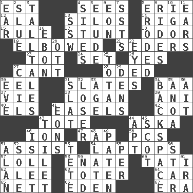 ACROSS 1. Eastern Standard Time (abbr.) 4. Observes 8. 4th largest of the Great Lakes 12. Wing 13. Grain storage towers 14. Capital of Latvia 15. Court order 17. Check the growth or development of 18. Scent 19. Shoved, as through a crowd 21. Spring feasts 23. Small child 24. Put into a specified state 26. It is so 27. Patter 28. Wrote a lyric poem 30. Snakelike fish 31. Chalkboards 34. Sound made by sheep 37. Compete 38. Utah city north of Ogden 39. Black tropical American cuckoo 40. Raised railways 41. Artist's stands 42. Small bed 43. Carryall 44. "____ silly question..." 46. Electrically charged atom 47. Reproach for some lapse or misdeed 50. Personal Computers (abbr.) 51. Help 54. Portable computers 57. Hang loosely or laxly 58. Maternal 60. Jacques of French films 62. Toward shelter 63. Carrier 64. Auto 65. Remaining after all deductions 66. Paradise 67. Period DOWN 1. Ewer handle 2. Turn sharply 3. Baron Munchausen's specialties 4. Locates 5. Evade 6. Period of immesurable duration 7. Fast planes 8. Eaten away 9. Amusement-park features 10. Composer Stravinsky 11. Hearing organs 13. Compass dir. 16. Inky black, to poets 20. Baseball player Mel 22. Snake ____ (dice throw) 25. "_____ Recall" 27. To provide with a ceiling 29. Cub Scout units 30. First lady 31. Narrow board 32. Failure 33. Grow older 34. Keyboard key 35. Small Philippine buffalo 36. Small island 41. Immeasurably long periods of time 43. Bathroom plumbing fixture 44. Fitting 45. Highlander 46. Small island 48. Having winglike extensions 49. Eucharist need 51. ____ Jay Lerner 52. Not divided or shared with others 53. False hair 55. For each 56. Play the lead 59. Allow head to fall sleepily 61. Retirement account (abbr.)