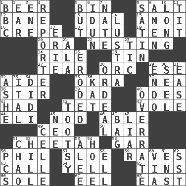 ACROSS 1. Fermented drink made from hops 5. Storage container 8. Table seasoning 12. Object of repulsion 13. Freehold land 15. Mine, in Marseilles 16. Streamer paper 18. Ballerina skirt 19. Portable shelter 20. Mouth or opening 22. Snuggling 24. Cause heat under the collar 26. Metal container 27. Lacerate 28. The grampus (Milton) 29. Compass dir. 32. Assistant 35. Gumbo ingredient 37. Teachers' org. 38. Use a spoon 39. June honoree 40. Lyric poems 41. Possessed 42. False hair 43. Short-tailed, large-bodied rat 44. Biblical high priest 45. Allow head to fall sleepily 46. Competent 49. Corporate head (abbr.) 50. Den 51. Leopard's kin 55. Slender fish 56. Silvers or Donahue 57. _ gin 59. All-night dance parties 63. Give a ring to 64. Shout 65. Airtight sealed metal containers 66. Not divided or shared with others 67. Snakelike fish 68. 90 degrees DOWN 1. English channel? 2. Hearing organ 3. Compass dir. 4. News announcer 5. Yet 6. Goddess of spring and wife of Bragi 7. Nathan's nickname 8. Smooth fabric 9. So be it 10. Yearn 11. Teat (slang) 14. A period of five years 17. One of the Great Lakes 21. Chicken ___ king 23. Nervous spasm 25. Eaten away 28. Severe or trying experience 29. Inside; within (prefix) 30. Stitch closed the eyes of (a falcon) 31. Comfort 32. American tennis player Robert 33. Slanted text style (abbr.) 34. "You Light Up My Life" star Conn 36. Krazy ___ of comics 40. Make much ado about nothing 42. Tootsie (variant) 45. Born 47. Paper or plastic container 48. One who doesn't tell the truth 49. Cell (Danish) 51. US Secretary of Labor Elaine L. _ 52. Land elevation 53. Toward shelter 54. Hollow 56. Personal Computers (abbr.) 58. Pipe bend 60. By way of 61. Followers of ems 62. Fast jet (abbr.)