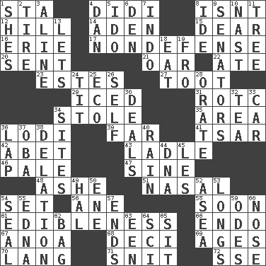 ACROSS 1. R.R. building 4. "You Light Up My Life" star Conn 8. Is not 12. Land elevation 14. Arabian gulf 15. Letter starter 16. 4th largest of the Great Lakes 17. Unrelated to defense, as in spending 20. Transmitted 21. Rowing implement 22. Had dinner 23. _____ Park, CO 27. A blast of a horn 29. On the rocks 31. College mil. group 34. Took without asking 35. Length times width 36. Farming town in central California 39. At a great distance 41. Russian ruler of old 42. Collude with 43. Dipping utensil 46. Light colored 47. Trig term 48. American tennis player Robert 51. Relating to the nose 54. Arrange properly for use 56. One (Scot) 58. Within a short period 61. The property of being fit to eat 66. Inside; within (prefix) 67. Small Philippine buffalo 68. Tenth: prefix 69. Eras 70. Austrian-born American filmmaker Fritz 71. In a ____ (agitated or irritated) 72. Compass dir. DOWN 1. "______ My Girl" (Turtles hit) 2. Hoop that covers a wheel 3. Place in a line 4. Daniel's nick name 5. Wedding promise 6. Lair 7. _ china 8. Binary compound 9. Elected representatives 10. Political cartoonist Thomas 11. Family _ (genealogy) 13. Allows 18. Ingest 19. From 24. Teat (slang) 25. Environmental prefix 26. Oneself 28. Declaim 30. Allots cards 32. Beverage made from leaves 33. Auto 34. Locates 36. Pet locale 37. Chief or king in Benin or Nigeria 38. Conveyance 40. Water falling in drops from the sky 44. Heredity factor (abbr.) 45. French article 49. Actor Linden 50. Compass dir. 52. At sea 53. Yearns 54. Lick closed 55. Pulitzer Prize-winning author Ferber 57. Conclusions 59. Lyric poems 60. Olfactory organ 62. Container for groceries 63. Car or cant ending 64. _-fi 65. Be seated