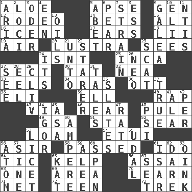 ACROSS 1. Medicinal plant 5. Domed church section 9. Commissioned mil. rank 12. Cowboy competition 14. Stakes 15. Keyboard modifier key 16. Ancient Celtic tribe of eastern Britain 17. Hearing organs 18. Cards in a Roman deck? 19. Wind 20. A period of five years 23. Perceives with the eye 24. Is not 25. South American Indian 27. Religious group 30. Make lace 32. Teachers' org. 33. Snakelike fish 34. Mouths or openings 36. Baseball player Mel 38. Biblical high priest 39. Pipe bend 40. Hit sharply and swiftly 43. By way of 46. Rump 48. Whine 49. Girls' org. (abbr.) 51. R.R. building 52. Scorch 53. Rich soil 54. Needle holder 56. SW Saudi Arabia district 58. Went by 61. Wedding promise 64. Nervous spasm 65. Seaweed 66. Slender Brazilian palm 68. Single 69. Type of rug 70. Memorize 71. Was introduced to 72. Adolescent 73. Long journey DOWN 1. Roberta Peters solo 2. Locales 3. River in Europe 4. Car or cant ending 5. Collude with 6. Lightbulb-shaped fruit 7. Put through a sieve 8. Double-curved letter 9. An organ shaped like a helmet 10. Writer Wiesel 11. Nuclear Threat Initiatives 13. Petroleums 21. To (old English) 22. A viewer who gazes fixedly 23. Jazz singing style 24. It is 26. Modern: prefix 27. Perceive with the eye 28. Snakelike fish 29. 154 in Roman numerals 31. Falsehoods 35. Chalkboards 37. Loyal 41. Chicken ___ king 42. For each 44. Composer Stravinsky 45. White ___ sheet 47. Assign a rank or rating to 48. 23rd letter of the Greek alphabet 50. Electrical Unit 53. It is permitted: Lat. 55. Allodial 56. Tiny particle 57. Trig term 59. Toward shelter 60. Connect, as a bridge 61. Austrian river, tributary to the Danube 62. Have the gumption 63. Pig sound 65. Krazy ___ of comics 67. Arrange properly for use