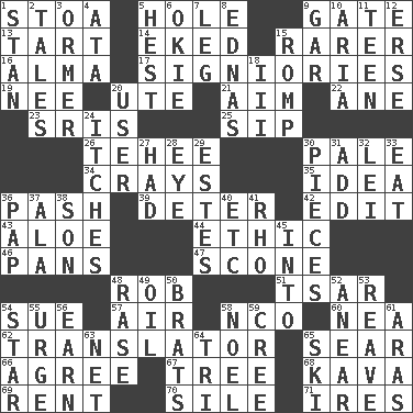 ACROSS 1. Portico 5. Opening into or through something 9. Yard entry 13. Small pie 14. Made supply last 15. Less widely known 16. _ mater 17. Seigniories (variant) 19. Born 20. Shoshoni 21. Direct toward a target or goal 22. One (Scot) 23. Indian titles of respect 25. Small drink 26. Giggle 30. Light colored 34. Trading vessels 35. It may be bright or harebrained 36. Romantic infatuation 39. Prevent from occurring 42. Prepare for publication 43. _ vera 44. Value system 46. Zero-star reviews 47. Biscuitlike quick bread 48. Director Reiner 51. Russian ruler of old 54. Institute legal proceedings 57. Wind 58. Non-commissioned officer (abbr.) 60. Teachers' org. 62. Interpreter 65. Dry up 66. Match 67. Relationship diagram 68. Polynesian shrub of the pepper family 69. Monthly bill 70. Drop; flow; fall 71. Angers DOWN 1. Comedian Laurel of Laurel & Hardy 2. Falsehoods 3. Abalone 4. _ moment's notice (2 wds.) 5. Command 6. Migrant worker of the '30s 7. Part of a journey 8. Ferber et al. 9. Slender fish 10. Operatic vocal solo 11. Adolescent 12. Celtic language 15. Play 18. One more than two 20. One who uses or employs something 24. Skin irritations 27. Possessed 28. Sight organ 29. _____ Park, CO 30. Components 31. Say or write further 32. Flowery wreath 33. Ingest 36. Infant food 37. Wing 38. Male offspring 40. And so on (abbr.) 41. 17th letter of the Greek alphabet 45. To the inside or interior of 48. Raze (variant) 49. Lubricate 50. Naughty children 52. Approach 53. Break or tear apart 54. Play the lead 55. Goad 56. Merit 58. Christmas carol 59. Algonquian 61. Caspian sea tributary 63. Fish or hair follower 64. Three (prefix) 65. What Jean-Claude Killy likes to do