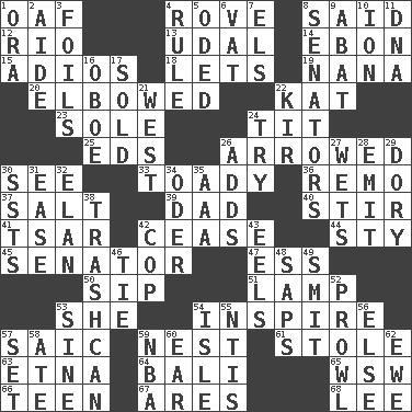 ACROSS 1. Clumsy lout 4. Be footloose 8. Stated 12. _ de Janeiro 13. Freehold land 14. Inky black, to poets 15. Goodbye (Sp.) 18. Allows 19. Grandmother 20. Turned at an angle; bent 22. Krazy ___ of comics 23. Flatfish 24. Teat (slang) 25. Begley and Asner 26. Moved like an arrow 30. Perceive with the eye 33. Sycophant 36. San ____ (Riviera town) 37. Table seasoning 39. June honoree 40. Commotion 41. Russian ruler of old 42. Stop 44. Filthy place 45. Legislator 47. Curvy letter 50. Small drink 51. Desk light 53. A female animal or person 54. Heighten or intensify 57. Ketch in the Levant 59. Egg locale 61. Fur scarf 63. Inactive volcano in Sicily 64. Indonesian resort city 65. Compass dir. 66. Adolescent 67. Ancient Greek god of war 68. Area sheltered from the wind DOWN 1. Mouth or opening 2. Helper 3. Fencing necessities 4. Governing power 5. Wrote a lyric poem 6. Large container 7. Raised railways 8. Elected representatives 9. Blind as ____ 10. Electrically charged atom 11. Heredity factor (abbr.) 16. Mitch Miller's instrument 17. Exchanged or delivered for money 21. 270 degrees 22. Apertif with cassis 24. Attempt to accomplish something 26. Does sums 27. Moistens 28. Give off 29. Small, narrow, flatbottom fishing boat 30. Fast planes 31. Comfort 32. Liveliness 34. River in Europe 35. American Automobile Association (abbr.) 38. File 13 42. Police officer (slang) 43. Snakelike fish 46. Standoff 48. Plant excrements 49. Stricken, poetically 52. Move like a hungry wolf 53. Trig term 54. Small island 55. Nuclear Threat Initiatives 56. Otherwise 57. Put into a specified state 58. Had dinner 59. Basketball assoc. 60. Hearing organ 62. She-sheep
