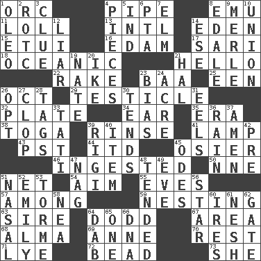 ACROSS 1. The grampus (Milton) 4. Corncob 8. Australian flightless bird 11. Hang loosely or laxly 13. International (abbr.) 14. Locale of original sin 15. Needle holder 16. Dutch treat 17. Indian skirt 18. Pertaining to the sea 21. Phone greeting 22. Libertine 23. Sound made by sheep 25. Car or cant ending 26. Sep. follower 29. One of the two male reproductive glands 32. Food holder 34. Ewer handle 35. Period 38. Ancient Roman robe 39. Remove soap 41. Desk light 43. Pacific Standard Time (abbr.) 44. It would 45. Flexible twig of a willow tree 46. Consumed 50. Compass dir. 51. Fish or hair follower 54. Direct toward a target or goal 55. Nights before holidays 57. Amid 59. Nestling 63. The founder of a family 64. Texas town _ City 67. Length times width 68. _ mater 69. Singer Murray 70. Relief 71. Potassium hydroxide 72. Necklace unit 73. A female animal or person DOWN 1. Margarine 2. College mil. group 3. A slight indication 4. Components 5. Indiana (abbr.) 6. Parent Teacher Assoc. 7. Shade tree 8. Peak District village in England 9. Haggard of country music 10. The state of being joined or united 12. One who doesn't tell the truth 14. Compass dir. 19. Nathan's nickname 20. Mamie's mate 21. Actor Linden 23. Prejudice 24. 43,560 square feet 26. Choose 27. Hoof sound 28. Labels 30. Watches over 31. Snakelike fish 33. Jacques of French films 36. Water falling in drops from the sky 37. So be it 39. Swiss mountan, "Queen of the Mountains" 40. Detail 42. Before (prefix) 45. Lyric poems 47. Tired old horse 48. Watched over 49. First lady 51. Rhinal 52. Poet Dickinson 53. Singer Mel 56. Play the lead 58. Teachers' org. 60. Angers 61. Soft 62. Yard entry 64. Pat or tap gently 65. Single 66. Heredity factor (abbr.)