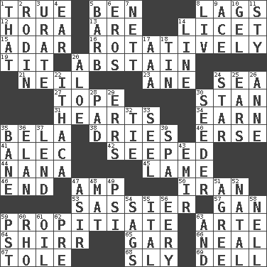 ACROSS 1. Loyal 5. Benjamin's nick name 8. Falls behind 12. Israeli folk dance 13. "We ___ not amused" (Victoria) 14. It is permitted: Lat. 15. The sixth month of the Jewish calendar 16. Happening in regular succession 19. Teat (slang) 20. Choose not to consume 21. Famous astronaut Armstrong 23. One (Scot) 24. Ocean 27. Drink excessively 30. Comedian Laurel of Laurel & Hardy 31. Centers of feelings and intuitions 34. Merit 35. Actor Lugosi 38. Frees from moisture 40. Celtic language 41. Actor Baldwin 42. Oozed 44. Nanny 45. Unable to walk 46. Conclude 47. Electrical Unit 50. SW Asia republic 53. More disrespectful 57. Separate the seeds from cotton 59. Appease 63. Johnson of "Laugh-In" 64. Bake eggs in their shells 65. Slender fish 66. Actress Patricia 67. Lacquered or enameled metalware 68. Roguish 69. Small valley DOWN 1. Not this but _ 2. "The Thinker" sculptor 3. A salt of uric acid 4. Ewer handle 5. Sharp remark 6. Greek god of love 7. Remaining after all deductions 8. 54 in ancient Rome 9. Adept person 10. Set 11. Filthy place 14. Actor's bit 17. Auto club (abbr.) 18. Metal container 20. Medicinal plant 22. New York city 24. Play the lead 25. Hearing organs 26. Queen of England 1702-14 28. Writing tablet 29. Blunders 30. Sowing specialist 32. Neckwear 33. Sew up the eyelids of hawks and falcons 35. Object of repulsion 36. Style 37. Grant temporary use of 39. Health resort 43. Independent ruler or chieftain 47. SW Saudi Arabia district 48. Floor covering 49. 23rd letter of the Greek alphabet 51. Match 52. Relating to or accompanying birth 54. Droops 55. Slanted text style (abbr.) 56. Suggestive of the supernatural 58. 1994 drama film starring Jodie Foster 59. Pacific Standard Time (abbr.) 60. 17th letter of the Greek alphabet 61. Lubricate 62. Before (prefix) 63. Plus