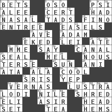 ACROSS 1. Wagers 5. Bear (Spanish) 8. Air pressure measure (abbr.) 11. Toward shelter 12. Certainty 14. Possessed 15. Relating to the nose 17. Bits 18. A pale, very dry sherry 19. Main course 21. Artist's stands 23. "___ Maria" 25. First of billions? 26. Made supply last 27. Luau accessory 28. Had dinner 31. Madame (abbr.) 33. Declare 35. Lessep's creation 37. Lick closed 38. Cartoonist voice _ Blanc 40. Horse sense 41. Laconic 43. Player for Phoenix 45. Black tropical American cuckoo 46. _ moment's notice (2 wds.) 47. In the manner of 50. Calm and collected 52. Indian titles of respect 53. Slangy assent 54. Actresses Bloom and Felton 56. A period of five years 61. Farming town in central California 62. Mediterranean tributary 65. Fragment 66. Biblical high priest 67. SW Saudi Arabia district 68. Froth on beer 69. Arrange properly for use 70. Afternoon social gathering 71. Cloth borders DOWN 1. Object of repulsion 2. Liveliness 3. Trial 4. Burn superficially 5. Sep. follower 6. Ocean 7. Severe or trying experience 8. Silvers or Donahue 9. Without 10. Wedding promise 13. Sadhe (variant) 16. Path through which fluid escapes 18. Opposite of masc. 20. Nights before holidays 22. Ketch in the Levant 24. Dutch treat 26. Snakelike fish 28. At once, immediately (arch.) 29. "Change" in Tahitian 30. Raised railways 31. Confront 32. Hindu Mythology: god of death 34. Consenting reply 36. Of or related to the anus 37. R.R. building 39. "I Love _" 42. Merit 44. Christmas carol 48. Woody, climbing, usually tropical plant 49. Help 51. Musical composition 52. _ Lanka 54. Short-tailed, large-bodied rat 55. Prepare for publication 57. Quiet! 58. Relationship diagram 59. 480, 500 or 516 sheets of paper 60. Sums up 61. French article 63. Whopper 64. Period