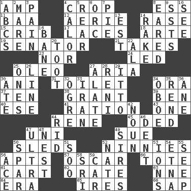 ACROSS 1. Electrical Unit 4. Riding implement 8. Curvy letter 11. Sound made by sheep 12. Nest on high 14. Raze (variant) 15. Baby bed with high sides 17. Shoestrings 18. Johnson of "Laugh-In" 19. Elected representative 21. Proceeds 23. Not either 24. Directed 25. Margarine 27. Roberta Peters solo 30. Black tropical American cuckoo 31. Rest room 34. Mouth or opening 37. Nine, plus one 38. Let have 39. Benjamin's nick name 40. Compass dir. 41. Food allowance for one day 43. Single 44. French philosopher Descartes 45. Wrote a lyric poem 47. Corn or form start 49. Take to court 50. Bobsleighs 52. Fools 56. Tenement units (abbr.) 57. Motion picture award 60. Carry 61. Draw slowly or heavily 62. Speak pompously 63. Compass dir. 64. Period 65. Angers 66. Plant excrement DOWN 1. Lettered men learn these first 2. Female horse 3. Ache 4. Bodily heat indicating an inflammation 5. Posterior 6. The grampus (Milton) 7. Sliced dessert 8. Having ears or earlike features 9. Fast planes 10. Observe 13. Eastern Standard Time (abbr.) 14. Immoral or dissolute person 16. Object of repulsion 20. A blast of a horn 22. Insect wing 25. Washington bills 26. Actor's bit 27. Having winglike extensions 28. Painter Guido (1575-1642) 29. "Tell ____ the Marines!" 30. Had dinner 32. Legendary monster 33. SW Asia republic 34. Mitch Miller's instrument 35. Tear apart 36. A saturated hydrocarbon 42. Part of speech 44. To free from 46. Gouge 47. Extreme 48. A home for chicks 49. Titles for men of rank and authority 50. Coast Guard woman 51. "Barney Miller" actor Jack 52. Nathan's nickname 53. Charged atoms 54. Inactive volcano in Sicily 55. Ooze 56. Adept person 58. Indian title of respect (Mr.) 59. Auto