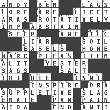 ACROSS 1. Actor Griffith 5. Benjamin's nick name 8. Fails to keep up a pace 12. Old wives' tales, e.g. 13. "We ___ not amused" (Victoria) 14. It is permitted: Lat. 15. Ancient river in northeast Turkey 16. Producing rotation 19. Naughty child 20. Refrain by choice 21. Ooze 23. A saturated hydrocarbon 24. Affectionate concern, for short 27. One who doesn't tell the truth 30. Land 31. Artist's stands 34. Residence 35. Drug cop 38. Entreaties 40. A whole individual unit 41. Set down 42. Next before 44. Sinks 45. Table seasoning 46. Three (prefix) 47. To riddle 50. Is not 53. Stimulate to action 57. Mouth or opening 59. Supplementary 63. Volcanic refuse 64. Maternal 65. Baking dish 66. Ache 67. Opera by Verdi 68. Conclude 69. Against DOWN 1. Mountain range southwest of Kyrgyzstan 2. Typical standards 3. Window treatment 4. It is so 5. Sharp remark 6. Greek god of love 7. Remaining after all deductions 8. 54 in ancient Rome 9. Adept person 10. Set 11. Filthy place 14. Actor's bit 17. Auto club (abbr.) 18. Metal container 20. Capital of Western Samoa 22. Chooses 24. A blast of a horn 25. Welles in "The Third Man" 26. Clement's nick name 28. Viper 29. Trust 30. Upper-body garments 32. Area sheltered from the wind 33. Backtalk 35. Political cartoonist Thomas 36. Having or resembling wings 37. Swiss mountan, "Queen of the Mountains" 39. R.R. building 43. Writer Wiesel 47. Cause heat under the collar 48. Compass dir. 49. Eastern Standard Time (abbr.) 51. Pitcher Ryan 52. Distinguishing feature 54. Corncob 55. _ the terrible 56. Tear apart 58. Hindu god of fire 59. Ocean 60. University (slang) 61. Writing tablet 62. Parent Teacher Assoc. 63. Health resort