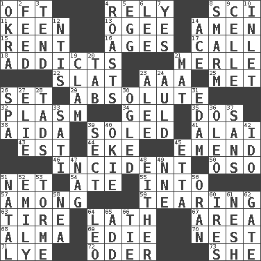 ACROSS 1. Often (poetically) 4. Depend 8. _-fi 11. Peachy ____! 13. Double curve, resembling the letter S 14. So be it 15. Monthly bill 16. Eons 17. Give a ring to 18. Inveterate users 21. Haggard of country music 22. Narrow board 23. American Automobile Association (abbr.) 25. Was introduced to 26. Arrange properly for use 29. Utter; complete 32. Suffix with ecto or cyto 34. Set 35. Two (Sp.) 38. Opera by Verdi 39. Having a sole or soles 41. Jai ____ 43. Eastern Standard Time (abbr.) 44. Make supply last 45. Make improvements or corrections to 46. Happening 50. Bear (Spanish) 51. Fish or hair follower 54. Had dinner 55. To the inside or interior of 57. Amid 59. Lacerating 63. Become fatigued 64. Thin strip of wood or metal 67. Type of rug 68. _ mater 69. Singer Brickell 70. A home for chicks 71. Sodium hydroxide 72. River in Europe 73. A female animal or person DOWN 1. Gumbo ingredient 2. Nourish 3. Look after 4. Exposes to great heat 5. Ovum 6. Area sheltered from the wind 7. It is so 8. Excessive but superficial compliments 9. Cell (Danish) 10. An arm off of a larger body of water 12. Nuclear Threat Initiatives 14. Adept person 19. Burrowing marine mollusk 20. Bar bill 21. Floor covering 23. Toward shelter 24. Old (Scot.) 26. Health resort 27. Writer Wiesel 28. Small amounts or degrees 30. Stared 31. Dutch treat 33. Suttee (variant) 36. Margarine 37. Without 39. Religious group 40. Migrant worker of the '30s 42. Wedding promise 45. Singer James 47. Tired old horse 48. One or the other of two 49. Compass dir. 51. Brizilian seaport 52. Poet Dickinson 53. Singer Mel 56. NW Algerian seaport 58. Teachers' org. 60. Angers 61. Tender 62. Yard entry 64. Lion 65. Increase 66. Make a knot