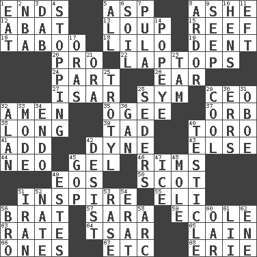 ACROSS 1. Extremities 5. Viper 8. American tennis player Robert 12. Blind as ____ 13. Central Nebraska county 15. Coral ridge 16. Off limits 18. _ and Stitch 19. Gouge 20. Adept person 22. Portable computers 24. Role in a play 26. Hearing organ 27. Austrian river, tributary to the Danube 28. Symbol (abbr.) 29. Corporate head (abbr.) 32. So be it 35. Double curve, resembling the letter S 37. Globe 38. Yearn 39. Bit 40. "Corrida" creature 41. Find the sum of 42. Unit of force 43. Otherwise 44. Modern: prefix 45. Set 46. Basketball hoops 49. Greek goddess of the dawn 50. Native of Scotland 51. Heighten or intensify 55. Connecticut Ivy Leaguer 56. Naughty child 57. "Two Mules for Sister ____" 59. Learning spot: Fr. 63. Assign a rank or rating to 64. Russian ruler of old 65. (Had) reclined 66. Singles 67. And so on (abbr.) 68. One of the Great Lakes DOWN 1. Erode 2. Basketball assoc. 3. Pat or tap gently 4. Closing up, plugging up 5. Everything 6. Earth 7. Monetary unit of Botswana 8. Zeal 9. Ooze 10. Coop moms 11. Lizard (obsolete) 14. Wimpy's pal 17. Mouths or openings 21. Mouth or opening 23. Scottish cap 25. Trinitrotoluene 28. Spring feasts 29. Calm and collected 30. Blunders 31. Mitch Miller's instrument 32. Actor Alda or Thicke 33. Method 34. Inside; within (prefix) 36. Separate the seeds from cotton 40. A testis 42. Stop 45. Republican Party 47. Frozen water 48. Undercover agent 49. _____ Park, CO 51. SW Asia republic 52. Nathan's nickname 53. To erase 54. Part of Q.E.F. 56. Sis' sibling 58. Curve 60. Boat paddle 61. Cards in a Roman deck? 62. Compass dir.