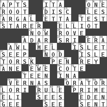 ACROSS 1. Flats, for short 5. Call ___ day 8. Single 11. Carrot, for example 12. Compact _ 14. French article 15. Therefore, facetiously 17. Singer James 18. Trial 19. A viewer who gazes fixedly 21. American author Paul (1891-1958) 23. Immediately 25. Be footloose 26. The sixth month of the Jewish calendar 27. Indian title of respect (Mr.) 28. Period 31. Leather borer 33. Cartoonist voice _ Blanc 35. Small island 37. Ooze 38. Lower and raise head in agreement 40. Small island 41. Cod relative 43. Writing instrument 45. Marina Del _, California 46. A saturated hydrocarbon 47. She-sheep 50. ____ d'Azur (French Riviera) 52. Adolescent 53. _ tizzy (2 wds.) 54. Actresses Bloom and Felton 56. Speaker 61. Australian parrot (variant) 62. Court order 65. First class 66. Connecticut Ivy Leaguer 67. Perceives with the eye 68. Locale of original sin 69. Turn to the right 70. Observe 71. Emitted DOWN 1. Caspian sea tributary 2. Left side of a ship or aircraft 3. Ancient Roman robe 4. Play the lead 5. Binary compound 6. Teat (slang) 7. Michaelmas daisies 8. Butter sub 9. Egg locale 10. Eastern Standard Time (abbr.) 13. Bodily heat indicating an inflammation 16. Grant temporary use of 18. Make a knot 20. Wander 22. 57 in ancient Rome 24. Songbird 26. High mountains 28. Otherwise 29. Have confidence or faith in 30. Had dinner 31. Age 32. Past tense of be (plural) 34. Trim (branches) 36. Title for a man of rank and authority 37. R.R. building 39. Tenth: prefix 42. Peachy ____! 44. Words to Nanette 48. Puts on (as clothing) 49. Follows as a consequence or result 51. Canvas cover 52. Three (prefix) 54. Grand slam 55. One of the Great Lakes 57. Ancient Greek god of war 58. Periodic rise and fall of the sea level 59. Sign of things to come 60. Monthly bill 61. Part of a journey 63. Area sheltered from the wind 64. Compass dir.