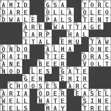 ACROSS 1. Among 5. Girls' org. (abbr.) 8. Torque (variant) 12. Have the gumption 13. Spanish pot 15. Margarine 16. A sleeping potion; an opiate (poet.) 18. Friends 19. Portable shelter 20. "We ___ not amused" (Victoria) 22. Electrical Measurement 24. Canvas cover 26. Actor Linden 27. Slanted text style (abbr.) 28. Australian flightless bird 29. The 23rd letter of the Hebrew alphabet 32. Southwest Nigerian state 35. _ mater 37. Single 38. Water falling in drops from the sky 39. Make a knot 40. Mouths or openings 41. A saturated hydrocarbon 42. Fermented drink made from hops 43. Electrical Unit 44. Allow head to fall sleepily 45. French article 46. Yard entry 49. Commissioned military rank (abbr.) 50. Arab leader 51. Opts 55. Curve 56. Operatic vocal solo 57. Baltic tributary 59. Artist's stand 63. Not ill 64. Nathan's nickname 65. Trig term 66. Snakelike fish 67. Can I? 68. Family _ (genealogy) DOWN 1. Say or write further 2. Informal term for the mouth 3. Retirement account (abbr.) 4. Accusation by an informer 5. Republican Party 6. Cole _ (cabbage dish) 7. Silent film actress Nazimova 8. Add up to 9. Cassini of fashion 10. French philosopher Descartes 11. Small bed 14. Respiratory problem 17. Part of Q.E.F. 21. Epoch 23. The 19th letter of the Greek alphabet 25. Food holders 28. Develop 29. "Corrida" creature 30. Of or related to the anus 31. Compass direction 32. Northwest Algerian city 33. Billionth: prefix 34. Passed on 36. Whopper 40. Cloudy 42. Gillaume's butler role 45. Lion 47. Wet nurse (var.) 48. Become fatigued 49. Scores awarded for successful feats 51. Algonquian 52. Land elevation 53. Dutch treat 54. Bristle 56. Deep reverence 58. Marina Del _, California 60. Title for a knight 61. Compass dir. 62. Area sheltered from the wind