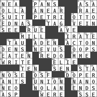 ACROSS 1. Teachers' org. 4. Baking dishes 8. White ___ sheet 11. Rounded earthenware pot or jar 13. Approach 15. Actress Charlotte 16. Costume for a special activity 17. _ dish (used to culture cells) 18. "Beetle Bailey" pooch 19. Ferber et al. 21. Label 22. Distinctive style or manner 23. Observe 24. Regret 27. "___ Maria" 29. Place where flour is made 30. Feeling or showing extreme anger 34. The 19th letter of the Greek alphabet 36. Arabian gulf 39. 13-14th century defensive garment 40. Habitations of wild animals 41. Congenital growth or mark on the skin 43. I made a mistake 44. Eroded 46. Do over again 47. Madame (abbr.) 48. Compose 49. Writer Wiesel 51. "___ Little Indians" 53. Elected rep. 54. R.R. building 57. Characteristic smell of wine 60. Order of Saint Francis (abbr.) 63. Drug addict 65. Pismires 66. The state of being joined or united 69. Billionth: prefix 70. Modern: prefix 71. Pitcher Ryan 72. Extremities 73. Viper 74. Past tense of be (plural) 75. Compass dir. DOWN 1. Olfactory organs 2. Evade 3. Place in a line 4. Infant food 5. One (Scot) 6. Remaining after all deductions 7. "Two Mules for Sister ____" 8. Johnson of "Laugh-In" 9. Suttee (variant) 10. Age 12. "One Day ___ Time" 14. Port city in Latvia 18. Conquer 20. _ Lanka 25. ____ Bator 26. A person who is older than you are 28. By way of 29. French bagpipes 31. Smallest unit of an element 32. Drink excessively 33. Followers of ems 34. Lacerate 35. Against 37. Night before a holiday 38. Unadorned figures 40. Morning condensation 42. Flatfish 45. Born 50. Working for oneself (abbr.) 52. Part of speech 54. Connects, as a bridge 55. Is inclined (to) 56. Came up 57. Grandmother 58. Washington bills 59. Cease 61. Frozen precipitation 62. Do some clerical work 64. Single 67. Boat paddle 68. Compass dir.