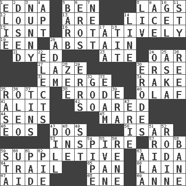 ACROSS 1. Pulitzer Prize-winning author Ferber 5. Benjamin's nick name 8. Straggles 12. Central Nebraska county 13. "We ___ not amused" (Victoria) 14. It is permitted: Lat. 15. Is not 16. Producing rotation 19. Car or cant ending 20. Choose not to consume 21. Colored 23. Had dinner 24. Rowing implement 27. Goldbrick 30. Celtic language 31. Develop 34. Libertine 35. College mil. group 38. Wear away 40. Norwegian king 41. Came down and settled, as after flight 42. Flew 44. Elected reps. 45. Female horse 46. Greek goddess of the dawn 47. Two (Sp.) 50. Austrian river, tributary to the Danube 53. Heighten or intensify 57. Director Reiner 59. Supplying deficiencies 63. Opera by Verdi 64. Get behind 65. Baking dish 66. (Had) reclined 67. Assistant 68. Compass dir. 69. Singer Murray DOWN 1. Writer Wiesel 2. Administered medicine 3. Pet term 4. Fitting 5. Sharp remark 6. Greek god of love 7. Remaining after all deductions 8. 54 in ancient Rome 9. Adept person 10. Set 11. Filthy place 14. Actor's bit 17. American Automobile Association (abbr.) 18. Teat (slang) 20. First of billions? 22. Chooses 24. Relating to the mouth 25. "____ silly question..." 26. Coral ridge 28. Last letter of the English alphabet 29. Blunders 30. Eats (away) 32. Thick or sticky substance 33. Dutch treat 35. To erase 36. Margarine 37. Airtight sealed metal containers 39. Period 43. 4th largest of the Great Lakes 47. Deli pickle 48. Single 49. Fast jet (abbr.) 51. Believer in; advocate of (suffix) 52. "The Thinker" sculptor 54. Corncob 55. _ the terrible 56. French philosopher Descartes 58. Object of repulsion 59. R.R. building 60. RI univ. 61. Writing tablet 62. Sliced dessert 63. Chicken ___ king
