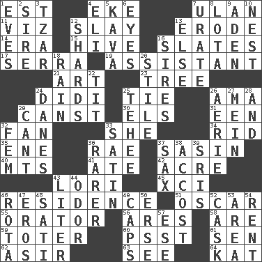 ACROSS 1. Eastern Standard Time (abbr.) 4. Supplement with great effort 7. ____ Bator 11. That is 12. Kill 13. Wear away 14. Period 15. Hub of activity 16. Chalkboards 17. Spanish missionary in California 19. Helper 21. Nonscientific branch of learning 23. Woody plant 24. "You Light Up My Life" star Conn 25. Make a knot 26. Nursemaid (var.) 29. 2nd pers. sing. pres. of can (arch.) 30. Raised railways 31. Car or cant ending 32. Avid follower 33. A female animal or person 34. To free from 35. Compass dir. 36. Actress Charlotte 37. Indian antelope 40. Mountains (abbr.) 41. Had dinner 42. Land measure 43. Australian parrot (variant) 45. One more than ninety 46. Dwelling 51. Motion picture award 55. Speaker 56. Ancient Greek god of war 58. "We ___ not amused" (Victoria) 59. Carrier 60. Inconspicuous attention getter 61. Elected rep. 62. SW Saudi Arabia district 63. Observe 64. Krazy ___ of comics DOWN 1. Nights before holidays 2. The founder of a family 3. Czar 4. Connecticut Ivy Leaguer 5. Polynesian shrub of the pepper family 6. Sight organs 7. A salt of uric acid 8. Globular water bottle used in Asia 9. An important port of Yemen 10. A home for chicks 12. Pottery fragments 13. Otherwise 16. Founders of families 18. Precipitation 20. Vertical member of a panel or frame 22. Teat (slang) 24. Natives or inhabitants of Denmark 25. Giggle 26. Nest on high 27. Count _ (2 wds.) 28. Added to 29. Patter 32. Opposite of masc. 33. Smooth fabric 36. More valued for its uncommonness 37. Saxophone 38. Buttonhole 39. Indian titles of respect 43. 61 cubic inches 44. Scent 46. Round or rotation of duties 47. Greek god of love 48. Suttee (variant) 49. Balmoral and tarboosh 50. Celtic language 52. Keg 53. Type of rug 54. Monthly bill 57. Compass dir.