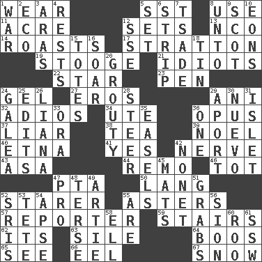 ACROSS 1. Erode 5. Fast jet (abbr.) 8. Purpose 11. 43,560 square feet 12. Puts into a specified state 13. Non-commissioned officer (abbr.) 14. Exposes to great heat 17. Ski resort town in Vermont 19. Moe Howard, for one 21. Foolish or stupid persons 22. Play the lead 23. Fenced enclosure 24. Set 27. Greek god of love 29. Cuckoo 32. Goodbye (Sp.) 34. Shoshoni 36. Musical composition 37. One who doesn't tell the truth 38. Beverage made from leaves 39. Christmas carol 40. Inactive volcano in Sicily 41. It is so 42. Impudent aggressiveness 43. White ___ sheet 44. San ____ (Riviera town) 46. Small child 47. Parent Teacher Assoc. 50. Long (Scottish) 52. A viewer who gazes fixedly 55. Michaelmas daisies 57. Newsperson 59. Flight of steps 62. It is 63. Filth; sediment 64. Scornful sounds 65. Observe 66. Snakelike fish 67. Overwhelm DOWN 1. Armed conflict 2. Environmental prefix 3. Ancient river in northeast Turkey 4. Musical pauses 5. Put into a specified state 6. Long narrow piece of something 7. Sadhe (variant) 8. To (old English) 9. Native of Scotland 10. Immeasurably long periods of time 12. Compass dir. 15. Lugs 16. Fly high 18. Shallow baking pan 20. Cross 24. An organ shaped like a helmet 25. Prepares for publication 26. Woody, climbing, usually tropical plant 28. Bull 29. To the left, to Queeg 30. New (sp.) 31. Small island 33. Mouth or opening 35. Artist's stands 36. Single 42. Music written for nine 45. Floor protectors 47. Adept person 48. Laconic 49. Nick name for Arthur 51. Takes hold of 52. Indian titles of respect 53. Wig 54. Domed church section 55. "We ___ not amused" (Victoria) 56. The Jewish people; Israel 58. Pipe bend 60. Friend of Pooh 61. Compass dir.