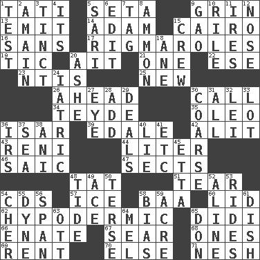 ACROSS 1. Jacques of French films 5. Bristle 9. Amused look 13. Give off 14. First man 15. Capital of Egypt 16. Without 17. Complicated, petty procedures 19. Nervous spasm 20. Small island 21. Single 22. Compass dir. 23. Nuclear Threat Initiatives 25. ___ Haven, CT 26. Toward the future 30. Give a ring to 34. Miss Universe 1986, Barbara Palacios _ 35. Butter sub 36. Austrian river, tributary to the Danube 39. Peak District village in England 42. Came down and settled, as after flight 43. Painter Guido (1575-1642) 44. 61 cubic inches 46. Ketch in the Levant 47. Religious groups 48. Make lace 51. Pull into pieces 54. Music discs 57. Frozen water 58. Sound made by sheep 60. Flaplike covering 62. Subcutaneous 65. "You Light Up My Life" star Conn 66. Maternal 67. Singe 68. Washington bills 69. Monthly bill 70. Otherwise 71. Soft DOWN 1. Trial 2. At full speed 3. Tinged 4. It is 5. Indian skirt 6. Prepare for publication 7. Label 8. ID or VA city 9. E Mali city 10. Cause heat under the collar 11. Angers 12. Sense of smell 15. Group working together 18. A saturated hydrocarbon 20. American tennis player Robert 24. Of or pertaining to medicine 27. Sight organ 28. Increase 29. Allots cards 30. Unrefined 31. Everything 32. Flowery wreath 33. Car dealer's back yard 36. Big collection agency 37. Ocean 38. Black tropical American cuckoo 40. Falsehood 41. And so on (abbr.) 45. Singer James 48. Event that recurs at intervals 49. Adept person 50. Laconic 52. Place in a line 53. Amusement-park features 54. "Mermaids" star 55. Unit of force 56. Connect, as a bridge 58. Prejudice 59. Land measure 61. Food container 63. Baseball player Mel 64. Cartoonist voice _ Blanc 65. Spanish title