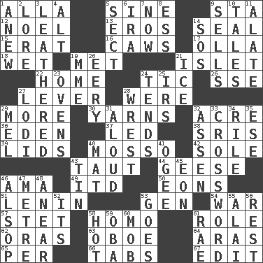ACROSS 1. Silent film actress Nazimova 5. Trig term 9. R.R. building 12. Christmas carol 13. Greek god of love 14. Lick closed 15. Part of Q.E.F. 16. Crow sounds 17. Rounded earthenware pot or jar 18. Dripping 19. Was introduced to 21. Small island 22. Dwelling 24. Nervous spasm 26. Compass dir. 27. Crowbar 28. We are 29. Greater amount 30. Tall tales 32. 43,560 square feet 36. Locale of original sin 37. Directed 38. Indian titles of respect 39. Hats (slang) 40. With motion or animation 42. Flatfish 43. Drawn tight 44. Honkers 46. Wet nurse (var.) 49. It would 50. Immeasurably long periods of time 51. Soviet premier 1918-24 53. Commissioned military rank (abbr.) 54. Armed conflict 57. Proofreading order 58. Same (prefix) 61. Hero or heavy, e.g. 62. Mouths or openings 63. Mitch Miller's instrument 64. Caspian sea tributary 65. For each 66. Bar bills 67. Prepare for publication DOWN 1. Afresh 2. Old wives' tales, e.g. 3. Resembling or made to resemble leather 4. The first octave above the treble staff 5. Religious group 6. Lyricist Gershwin 7. At this time 8. Double-curved letter 9. Exchanges for money 10. Falsehoods 11. Having winglike extensions 14. Distress signal 19. Madame (abbr.) 20. Suggestive of the supernatural 21. Frozen water 23. Baking chambers 24. Watches over 25. Big collection agency 27. Farming town in central California 28. Obtain by seizing forcibly or violently 29. Cartoonist voice _ Blanc 31. Verbally 32. NE Netherlands city 33. What you're doing now 34. Cause heat under the collar 35. Compass dir. 40. Floor protector 41. Double curve, resembling the letter S 43. Shallow baking pan 45. Age 46. Columnist Joseph or Stewart 47. Distance measurement (Brit.) 48. Approach 52. ___ a Wonderful Life 53. Leaves 55. Jai _ 56. Remainder 58. Being at a high temperature 59. Chief or king in Benin or Nigeria 60. Crowd into 61. Actress Charlotte