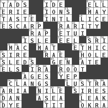 ACROSS 1. Bits 5. Binary compound 8. Pipe bend 11. One of the Great Lakes 12. Charged particles 14. Fifth month 15. Clothes sense 17. International (abbr.) 18. Louse (plural) 19. Fortification 21. Noteworthy scarcity 23. Hit sharply and swiftly 25. Needle holder 26. Small island 27. Snakelike fish 28. Indian title of respect (Mr.) 31. Apple computer (short form) 33. Floor covering 35. Moral principle 37. Male parent of an animal 38. Actress Charlotte 40. Hollow 41. Bobsleighs 43. Commissioned military rank (abbr.) 45. Had dinner 46. Raised railways 47. Lyricist Gershwin 50. Carrot, for example 52. Eras 53. Slangy assent 54. Rigngs loudly 56. A period of five years 61. Roberta Peters solo 62. Mediterranean tributary 65. Founders of families 66. Daniel's nick name 67. Toward the sea 68. Path through which fluid escapes 69. Color 70. Teat (slang) 71. Gumbo ingredient DOWN 1. Wig 2. Caspian sea tributary 3. Flat circle 4. Stalk of a moss capsule 5. One more than two 6. Spanish title 7. Main course 8. Send forth 9. Made of lace 10. Potassium hydroxide 13. Schedule 16. Blunders 18. Cards in a Roman deck? 20. Inside of hand 22. Court order 24. Lightbulb-shaped fruit 26. On the rocks 28. Attempt 29. Cause heat under the collar 30. Frozen water 31. Place where flour is made 32. Ancient Greek god of war 34. Label 36. Not this but _ 37. Compass dir. 39. Suggestive of the supernatural 42. Attach a signature 44. Christmas carol 48. Rain (Swedish) 49. Aid 51. Musical composition 52. Auto club (abbr.) 54. Supercomputer manufacturer 55. Actor's bit 57. Grain storage tower 58. Long journey 59. Stern 60. "____ silly question..." 61. Say or write further 63. Flowery wreath 64. Erode