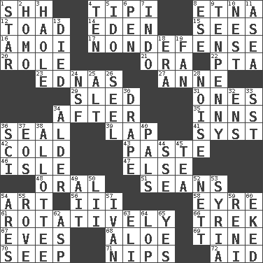 ACROSS 1. Quiet! 4. Native american tent (variation) 8. Inactive volcano in Sicily 12. Frog relative 14. Paradise 15. Observes 16. Mine, in Marseilles 17. Unrelated to defense, as in spending 20. Hero or heavy, e.g. 21. Mouth or opening 22. Parent Teacher Association (abbr.) 23. Ferber et al. 27. Queen of England 1702-14 29. Downhill vehicle 31. Singles 34. Following 35. Taverns 36. Lick closed 39. Infant locale 41. System (abbr.) 42. Having a low temperature 43. Thick mixture 46. Small island 47. Otherwise 48. Spoken 51. Seines 54. Nonscientific branch of learning 56. One more than two 58. Jane of fiction 61. Happening in regular succession 66. Long journey 67. Nights before holidays 68. _ vera 69. Prong on a fork 70. Ooze 71. Pinches, bites 72. Help DOWN 1. Play the lead 2. Same (prefix) 3. White Person, in Hawaii 4. Nine, plus one 5. Wedding promise 6. Animal enclosure 7. Southeast Asian peninsula 8. Compass dir. 9. 3-inch nail 10. A home for chicks 11. At sea 13. Passed on 18. Period 19. Avid follower 24. Overdraft (abbr.) 25. Keyboard modifier key 26. Stitch closed the eyes of (a falcon) 28. Annoying sound 30. Window treatment 32. Followers of ems 33. Fast jet (abbr.) 34. Tree or shrub in the Birch family 36. _-fi 37. Greek goddess of the dawn 38. One to whom something is allotted 40. Friends 44. Compass dir. 45. Afternoon social gathering 49. Small island 50. Cards in a Roman deck? 52. Remaining after all deductions 53. Damascus' land 54. Ancient Greek god of war 55. Be footloose 57. _ the terrible 59. Painter Guido (1575-1642) 60. Made supply last 62. Cleo's killer 63. Biblical high priest 64. Chop off 65. Affirmative reply