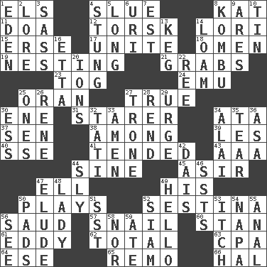 ACROSS 1. Raised railways 4. Change direction abruptly 8. Krazy ___ of comics 11. ___ good deed 12. Cod relative 14. Australian parrot (variant) 15. Celtic language 17. Join together 18. Presage 19. Snuggling 21. Catches 23. Coat; cloak 24. Australian flightless bird 25. Northwest Algerian city 27. Loyal 30. Compass dir. 31. A viewer who gazes fixedly 34. _ moment's notice (2 wds.) 37. Elected rep. 38. Amid 39. French article 40. Compass dir. 41. Looked after 43. American Automobile Association (abbr.) 44. Trig term 45. SW Saudi Arabia district 47. Pipe bend 49. Part of HMS, perhaps 50. Frolics 52. French poetic form 56. Saudi Arabian king (1953-1964) 57. Slow-paced one 60. Comedian Laurel of Laurel & Hardy 61. Whirlpool 62. "_____ Recall" 63. Tax preparer (abbr.) 64. Compass dir. 65. San ____ (Riviera town) 66. Actor Linden DOWN 1. Genesis locale 2. Old wives' tales, e.g. 3. Backtalk 4. Feeling sharp psychological pain 5. Yearn 6. RI univ. 7. Eastern Standard Time (abbr.) 8. Dried seaweed eaten as food 9. Ancient Greek god of war 10. Metal container 13. Cask 14. Rich soil 16. Singer James 20. Charged atoms 22. Portuguese money of account (variant) 25. Singles 26. French philosopher Descartes 27. Marketplace scale 28. Tear apart 29. Goad 30. Curvy letter 32. Jacques of French films 33. So be it 34. Mountain range southwest of Kyrgyzstan 35. Rend 36. White ___ sheet 42. Raised platform 44. Playfully artful 46. Fast planes 47. Dodge 48. Kenny Rogers chart-topper in '80 49. Phone greeting 50. Groovy apts. 51. Fast jet (abbr.) 52. Thailand, formerly 53. Hankering 54. California wine valley 55. Of or related to the anus 56. Perceive with the eye 58. And not 59. Had dinner