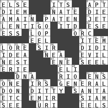 ACROSS 1. Otherwise 5. It is 8. Fitting 11. South Vietnam president (1954) 12. Nathan's nickname 14. Expire 15. At full speed 17. Eucharist need 18. Passenger plane 19. Small, flat, pigmented spot on the skin 21. It would 22. Compass dir. 23. Curvy letter 24. Chop off 25. The grampus (Milton) 27. Snakelike fish 28. Detail 31. Old wives' tales, e.g. 35. Title for a knight 37. "You Light Up My Life" star Conn 38. It may be bright or harebrained 39. Teachers' org. 41. Morally bad or wrong 42. Egg locale 43. Compass dir. 45. Sew up the eyelids of hawks and falcons 46. One of the Great Lakes 47. Biblical high priest 49. Heredity factor (abbr.) 51. River (Sp.) 52. Followers of ems 55. Single 57. Big collection agency 60. Commissioned military rank 62. Spanish title 63. Simple song 65. Before Barbara or Clara 66. And so on (abbr.) 67. Independent ruler or chieftain 68. Thailand, formerly 69. Observe 70. RI univ. 71. Snakelike fish DOWN 1. Peak District village in England 2. Citrus fruits 3. Actors Connery and Penn 4. Send forth 5. _ tizzy (2 wds.) 6. Jacques of French films 7. Proofreading order 8. Descriptive word 9. Sliced desserts 10. Wig 13. Inside; within (prefix) 16. Mediterranean tributary 17. Cotton for raincoats, e.g. 20. Leaves 26. Amusement-park features 29. Singer Brickell 30. Place where flour is made 31. Actor's bit 32. River in Europe 33. Dwelling 34. Consumed 36. Portuguese money of account (variant) 40. Disorder of the immune system 44. Writer Wiesel 48. Charged atoms 50. Assistant 52. Bert's buddy 53. Brizilian seaport 54. Shuts with force 55. Lyric poems 56. Brief written record 58. Tall New Zealand timber tree 59. Commotion 61. Relaxation 64. Three (prefix)